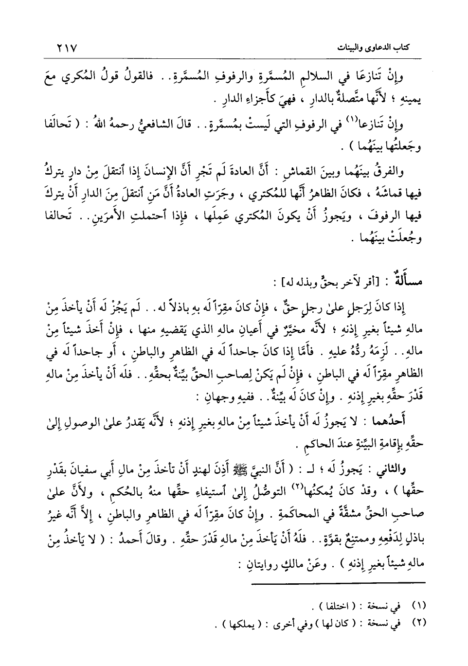 والثاني: يجوز له؛ لـ: «أن النبي - صَلَّى اللَّهُ عَلَيْهِ وَسَلَّمَ - أذن لهند أن تأخذ من مال أبي سفيان بقدر حقها» ، وقد كان يمكنها التوصل إلى استيفاء حقها منه بالحكم، ولأن على صاحب الحق مشقة في المحاكمة. وإن كان مقرا له في الظاهر والباطن، إلا أنه غير باذل لدفعه وممتنع بقوة.. فله أن يأخذ من ماله قدر حقه. وقال أحمد: (لا يأخذ من ماله شيئا بغير إذنه) . وعن مالك روايتان: