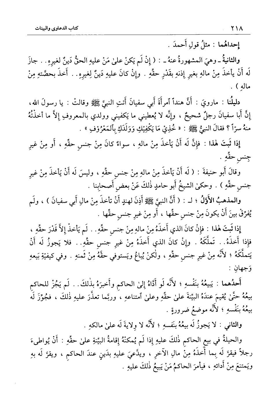 والمذهب الأول؛ لـ: «أن النبي - صَلَّى اللَّهُ عَلَيْهِ وَسَلَّمَ - أذن لهند أن تأخذ من مال أبي سفيان» ، ولم يفرق بين أن يكون من جنس حقها، أو من غير جنس حقها.