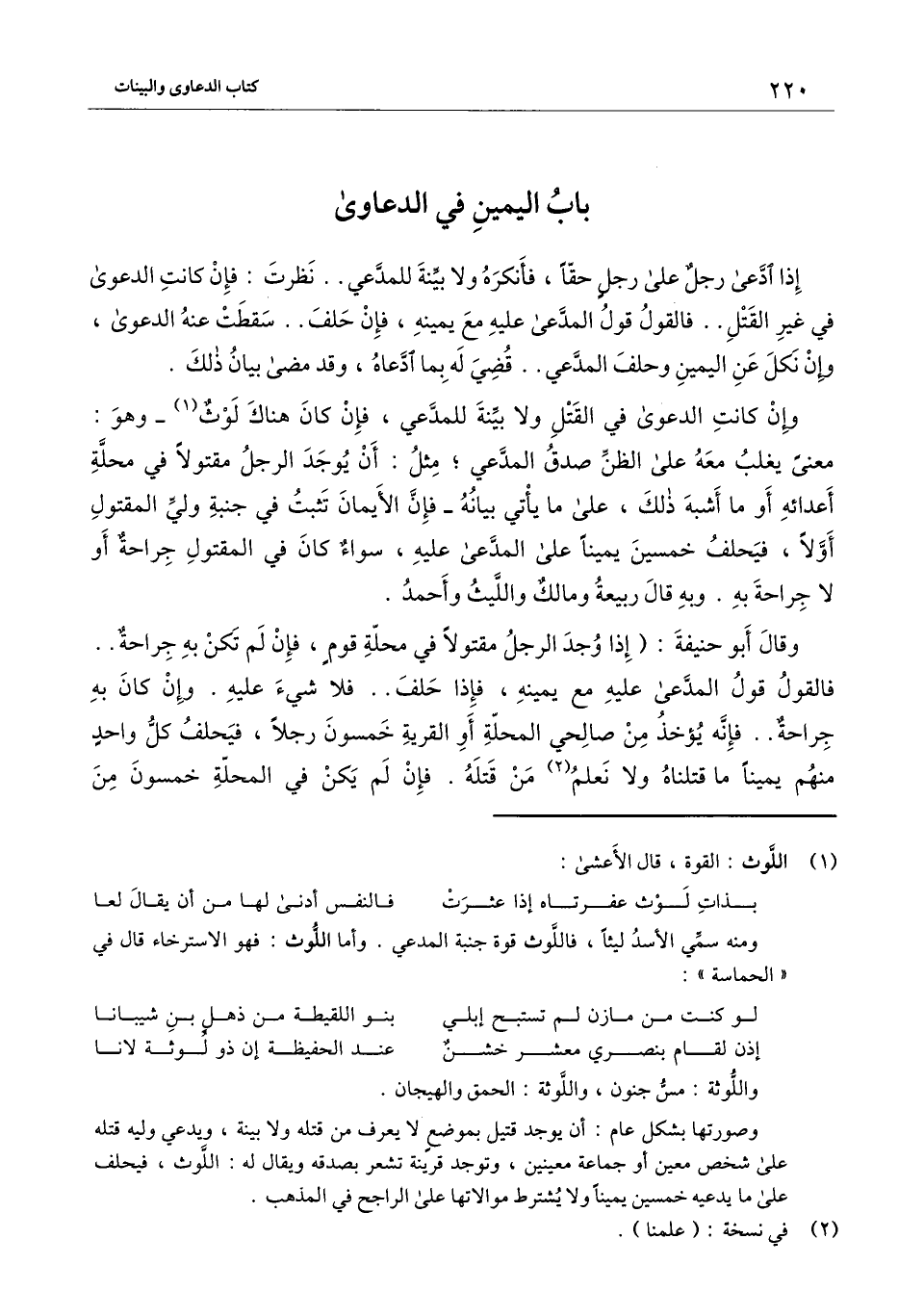 وإن كانت الدعوى في القتل ولا بينة للمدعي، فإن كان هناك لوث - وهو: معنى يغلب معه على الظن صدق المدعي؛ مثل أن يوجد الرجل مقتولا في محلة أعدائه أو ما أشبه ذلك، على ما يأتي بيانه- فإن الأيمان تثبت في جنبة ولي المقتول أولا، فيحلف خمسين يمينا على المدعى عليه، سواء كان في المقتول جراحة أو لا جراحة به. وبه قال ربيعة ومالك والليث وأحمد.