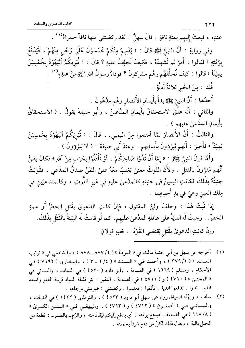 وفي رواية: أن النبي - صَلَّى اللَّهُ عَلَيْهِ وَسَلَّمَ - قال: «يقسم منكم خمسون على رجل منهم، فيدفع برمته» فقالوا: أمر لم نشهده، فكيف نحلف عليه؟ قال: «تبريكم اليهود بخمسين يمينا» قالوا:. كيف نحلفهم وهم مشركون؟ فوداه رسول الله - صَلَّى اللَّهُ عَلَيْهِ وَسَلَّمَ - من عنده.