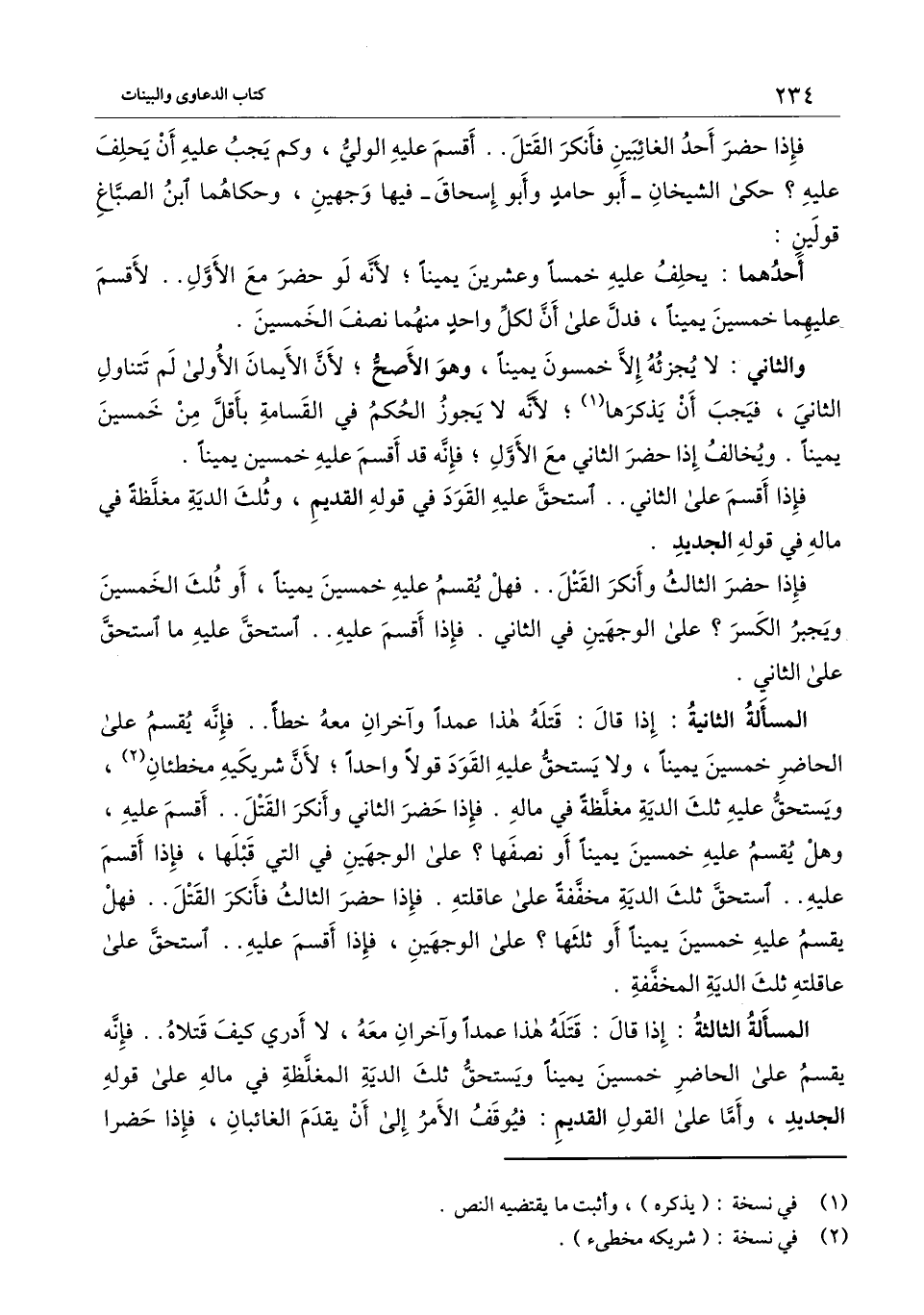 المسألة الثانية: إذا قال: قتله هذا عمدا وآخران معه خطأ.. فإنه يقسم على الحاضر خمسين يمينا، ولا يستحق عليه القود قولا واحدا؛ لأن شريكيه مخطئان، ويستحق عليه ثلث الدية مغلظة في ماله. فإذا حضر الثاني وأنكر القتل.. أقسم عليه، وهل يقسم عليه خمسين يمينا أو نصفها؟ على الوجهين في التي قبلها، فإذا أقسم عليه.. استحق ثلث الدية مخففة على عاقلته. فإذا حضر الثالث فأنكر القتل.. فهل يقسم عليه خمسين يمينا أو ثلثها؟ على الوجهين، فإذا أقسم عليه.. استحق على عاقلته ثلث الدية المخففة.