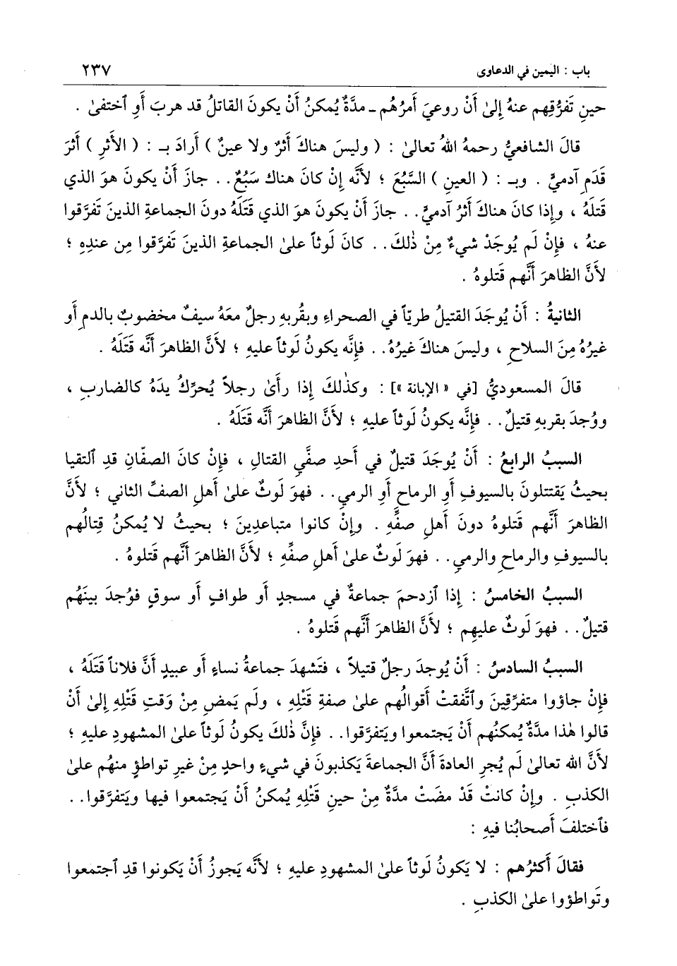 قال الشافعي - رَحِمَهُ اللَّهُ تَعَالَى -: (وليس هناك أثر ولا عين) أراد بـ: (الأثر) أثر قدم آدمي. وبـ: (العين) السبع؛ لأنه إن كان هناك سبع.. جاز أن يكون هو الذي قتله، وإذا كان هناك أثر آدمي.. جاز أن يكون هو الذي قتله دون الجماعة الذين تفرقوا عنه، فإن لم يوجد شيء من ذلك.. كان لوثا على الجماعة الذين تفرقوا من عنده؛ لأن الظاهر أنهم قتلوه.
