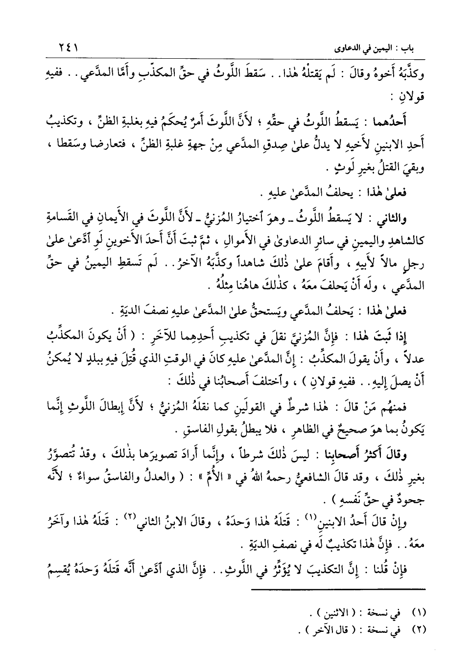 والثاني: لا يسقط اللوث - وهو اختيار المزني - لأن اللوث في الأيمان في القسامة كالشاهد واليمين في سائر الدعاوى في الأموال، ثم ثبت أن أحد الأخوين لو ادعى على رجل مالا لأبيه، وأقام على ذلك شاهدا وكذبه الآخر.. لم تسقط اليمين في حق المدعي، وله أن يحلف معه، كذلك هاهنا مثله.