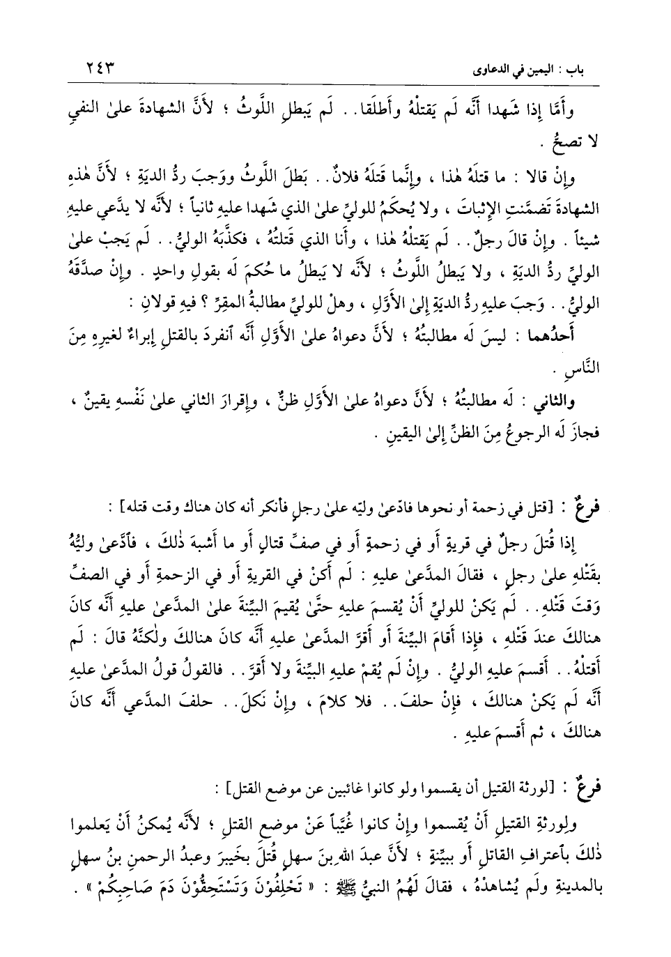 وأما إذا شهدا أنه لم يقتله وأطلقا.. لم يبطل اللوث، لأن الشهادة على النفي لا تصح. وإن قالا: ما قتله هذا، وإنما قتله فلان.. بطل اللوث ووجب رد الدية؛ لأن هذه الشهادة تضمنت الإثبات، ولا يحكم للولي على الذي شهدا عليه ثانيا؛ لأنه لا يدعي عليه شيئا. وإن قال رجل.. لم يقتله هذا، وأنا الذي قتلته، فكذبه الولي.. لم يجب على الولي رد الدية، ولا يبطل اللوث؛ لأنه لا يبطل ما حكم له بقول واحد. وإن صدقه الولي.. وجب عليه رد الدية إلى الأول، وهل للولي مطالبة المقر؟ فيه قولان: أحدهما: ليس له مطالبته؛ لأن دعواه على الأول أنه انفرد بالقتل إبراء لغيره من الناس. والثاني: له مطالبته لأن دعواه على الأول ظن وإقرار الثاني على نفسه يقين، فجاز له الرجوع من الظن إلى اليقين.