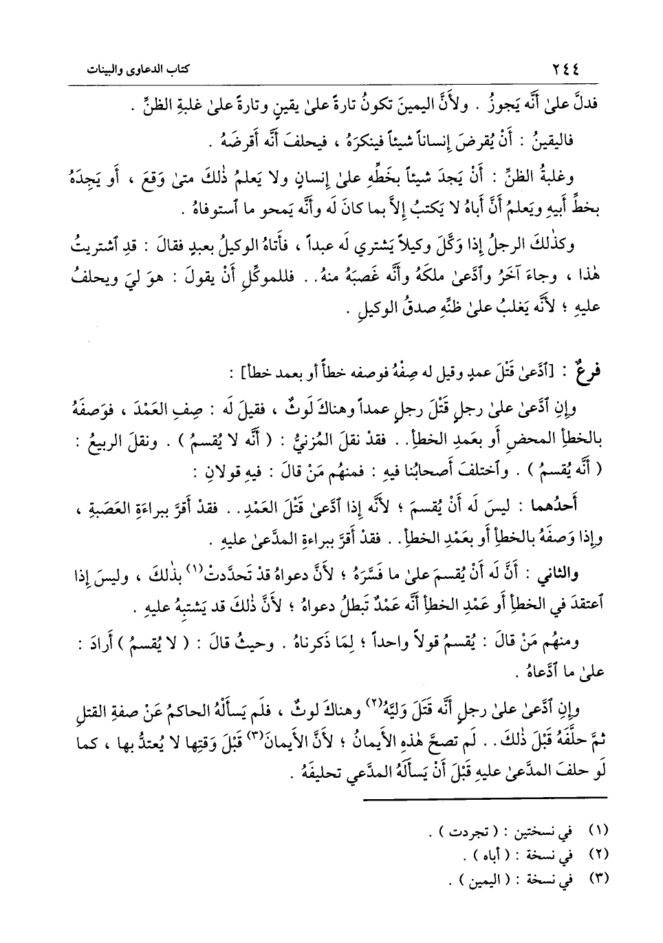 والثاني: أن له أن يقسم على ما فسره؛ لأن دعواه قد تحددت بذلك، وليس إذا اعتقد في الخطأ أو عمد الخطأ أنه عمد تبطل دعواه؛ لأن ذلك قد يشتبه عليه.