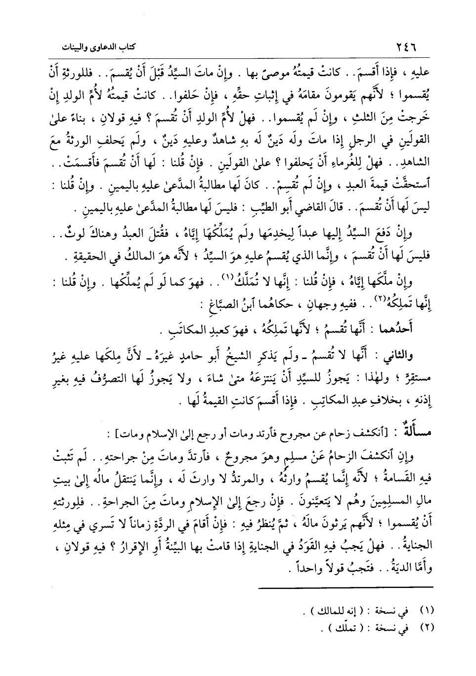 عليه، فإذا أقسم.. كانت قيمته موصى بها. وإن مات السيد قبل أن يقسم.. فللورثة أن يقسموا؛ لأنهم يقومون مقامه في إثبات حقه، فإن حلفوا.. كانت قيمته لأم الولد إن خرجت من الثلث، وإن لم يقسموا.. فهل لأم الولد أن تقسم؟ فيه قولان، بناء على القولين في الرجل إذا مات وله دين له به شاهد وعليه دين، ولم يحلف الورثة مع الشاهد.. فهل للغرماء أن يحلفوا؟ على القولين. فإن قلنا: لها أن تقسم فأقسمت.. استحقت قيمة العبد، وإن لم تقسم.. كان لها مطالبة المدعى عليه باليمين. وإن قلنا: ليس لها أن تقسم.. قال القاضي أبو الطيب: فليس لها مطالبة المدعى عليه باليمين.