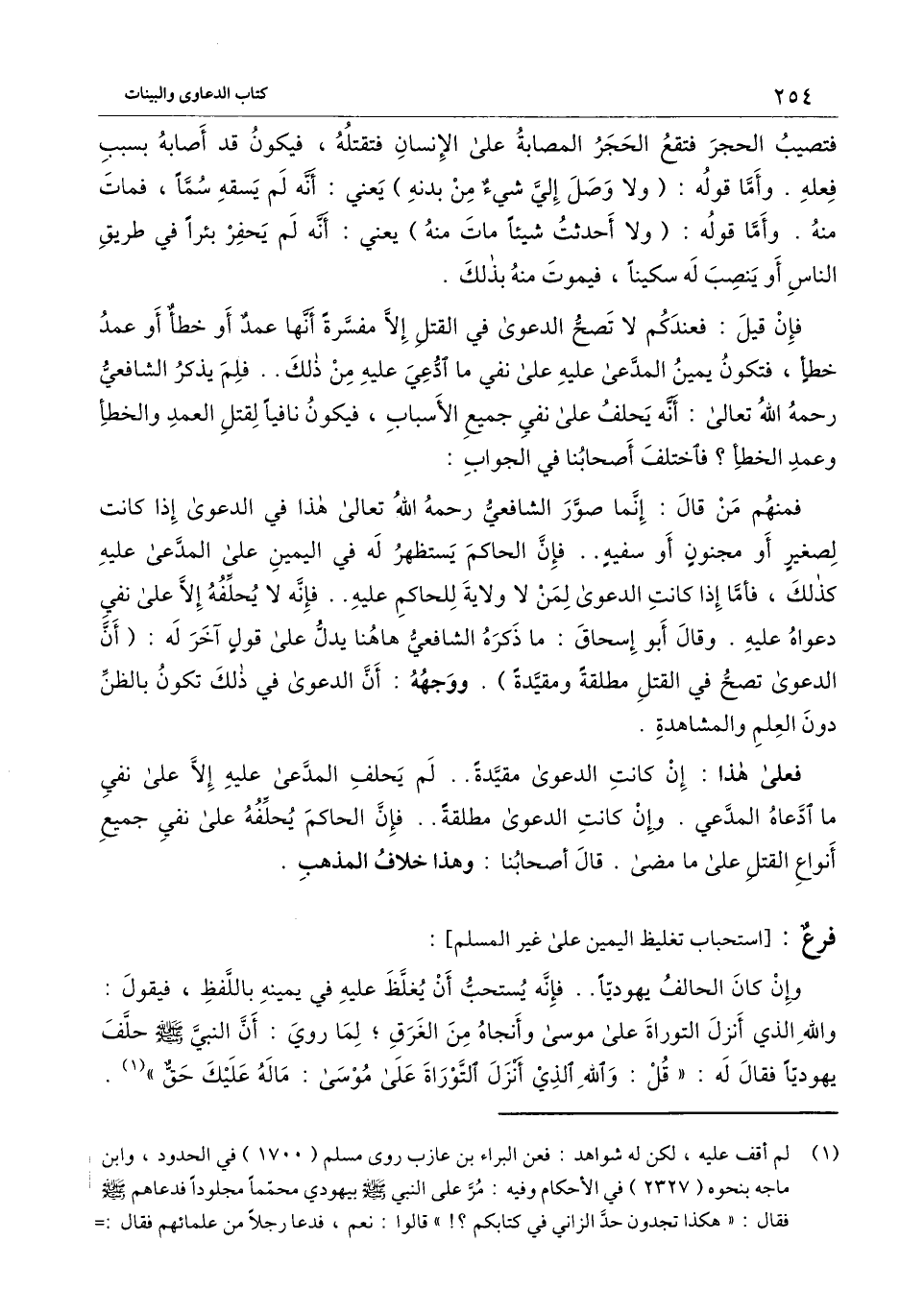 فمنهم من قال: إنما صور الشافعي - رَحِمَهُ اللَّهُ تَعَالَى - هذا في الدعوى إذا كانت لصغير أو مجنون أو سفيه.. فإن الحاكم يستظهر له في اليمين على المدعى عليه كذلك، فأما إذا كانت الدعوى لمن لا ولاية للحاكم عليه.. فإنه لا يحلفه إلا على نفي دعواه عليه. وقال أبو إسحاق: ما ذكره الشافعي هاهنا يدل على قول آخر له: (أن الدعوى تصح في القتل مطلقة ومقيدة) . ووجهه: أن الدعوى في ذلك تكون بالظن دون العلم والمشاهدة.