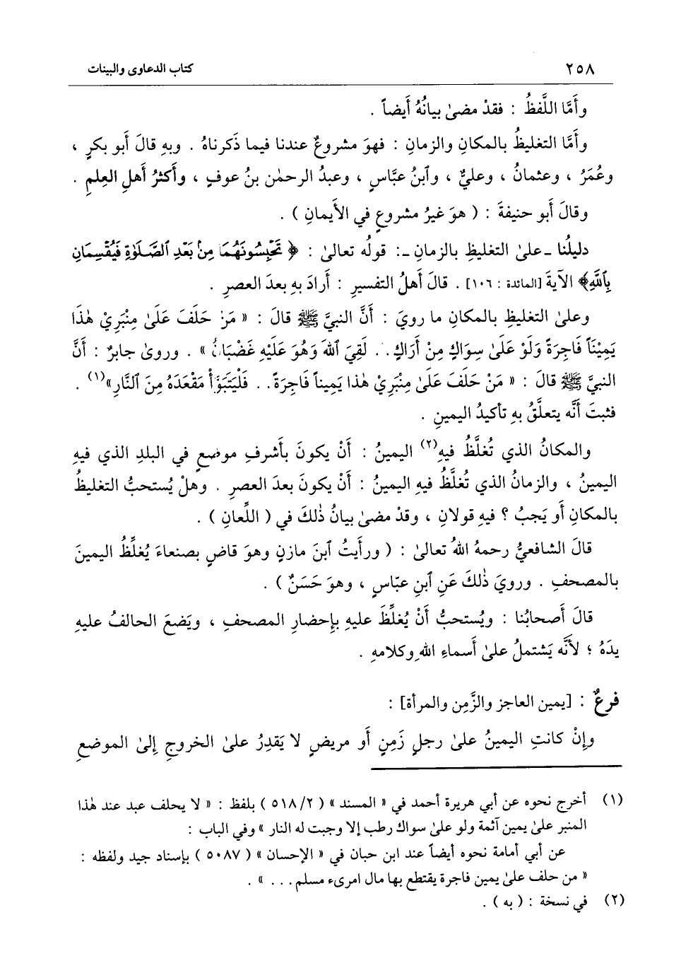 وعلى التغليظ بالمكان ما روي: أن النبي - صَلَّى اللَّهُ عَلَيْهِ وَسَلَّمَ - قال: «من حلف على منبري هذا يمينا فاجرة ولو على سواك من أراك.. لقي الله وهو عليه غضبان» . وروى جابر: أن النبي - صَلَّى اللَّهُ عَلَيْهِ وَسَلَّمَ - قال: «من حلف على منبري هذا يمينا فاجرة.. فليتبوأ مقعده من النار» . فثبت أنه يتعلق به تأكيد اليمين.
