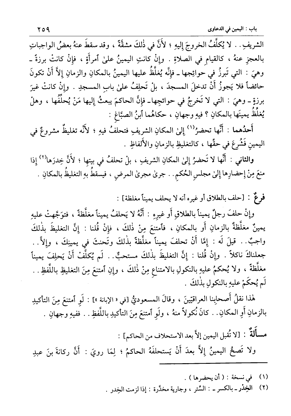 الشريف.. لا يكلف الخروج إليه؛ لأن في ذلك مشقة، وقد سقط عنه بعض الواجبات بالعجز عنه، كالقيام في الصلاة. وإن كانت اليمين على امرأة، فإن كانت برزة - وهي: التي تبرز في حوائجها - فإنه يغلظ عليها اليمين بالمكان والزمان إلا أن تكون حائضا فلا يجوز أن تدخل المسجد، بل تحلف على باب المسجد. وإن كانت غير برزة - وهي: التي لا تخرج في حوائجها - فإن الحاكم يبعث إليها من يحلفها، وهل يغلظ يمينها بالمكان؟ فيه وجهان، حكاهما ابن الصباغ: