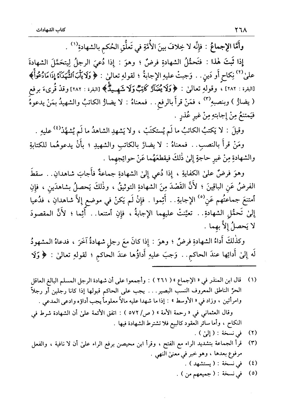 إذا ثبت هذا: فتحمل الشهادة فرض؛ وهو: إذا دعي الرجل ليتحمل الشهادة على نكاح أو دين.. وجبت عليه الإجابة؛ لِقَوْلِهِ تَعَالَى: {وَلا يَأْبَ الشُّهَدَاءُ إِذَا مَا دُعُوا} [البقرة: 282] [البقرة: 282] ، وقَوْله تَعَالَى: {وَلا يُضَارَّ كَاتِبٌ وَلا شَهِيدٌ} [البقرة: 282] [البقرة: 282] وقد قرئ برفع (يضار) وبنصبه، فمن قرأ بالرفع.. فمعناه: لا يضار الكاتب والشهيد بمن يدعوه فيمتنع من إجابته بغير عذر.
