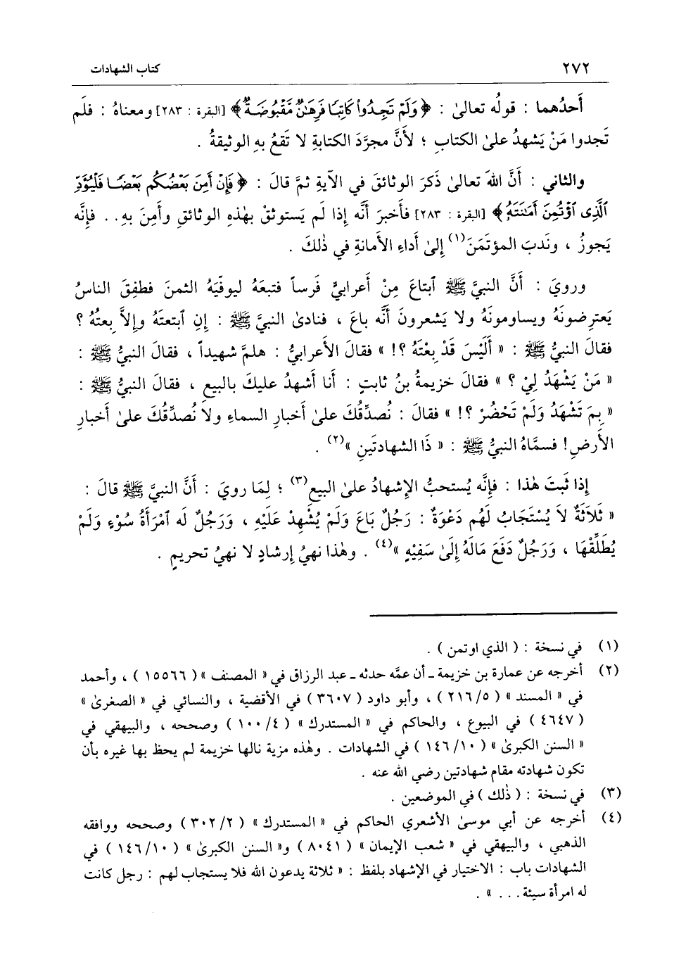 وروي: «أن النبي - صَلَّى اللَّهُ عَلَيْهِ وَسَلَّمَ - ابتاع من أعرابي فرسا فتبعه ليوفيه الثمن فطفق الناس يعترضونه ويساومونه ولا يشعرون أنه باع، فنادى النبيَّ - صَلَّى اللَّهُ عَلَيْهِ وَسَلَّمَ -: إن ابتعته وإلا بعته؟ فقال النبي - صَلَّى اللَّهُ عَلَيْهِ وَسَلَّمَ -: " أليس قد بعته؟! " فقال الأعرابي: هلم شهيدا، فقال النبي - صَلَّى اللَّهُ عَلَيْهِ وَسَلَّمَ -: " من يشهد لي؟ " فقال خزيمة بن ثابت: أنا أشهد عليك بالبيع، فقال النبي - صَلَّى اللَّهُ عَلَيْهِ وَسَلَّمَ -: " بم تشهد ولم تحضر؟! " فقال: نصدقك على أخبار السماء ولا نصدقك على أخبار الأرض! فسماه النبي - صَلَّى اللَّهُ عَلَيْهِ وَسَلَّمَ -: " ذا الشهادتين» .
