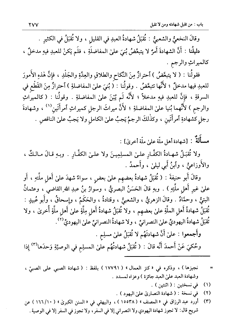 وقال النخعي والشعبي: تقبل شهادة العبد في القليل، ولا تقبل في الكثير.