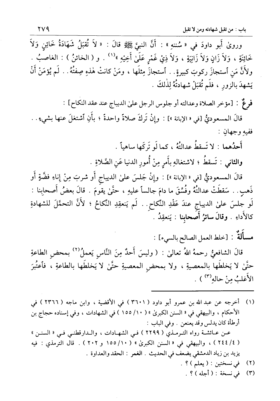 قال المسعودي [في " الإبانة "] : وإن جلس على الديباج أو شرب من إناء فضة أو ذهب.. سقطت عدالته وفسق ما دام جالسا عليه، حتى يقوم. قال بعض أصحابنا: لو جلس على الديباج عند عقد النكاح.. لم ينعقد النكاح؛ لأن التحمل للشهادة كالأداء. وقال سائر أصحابنا: ينعقد.