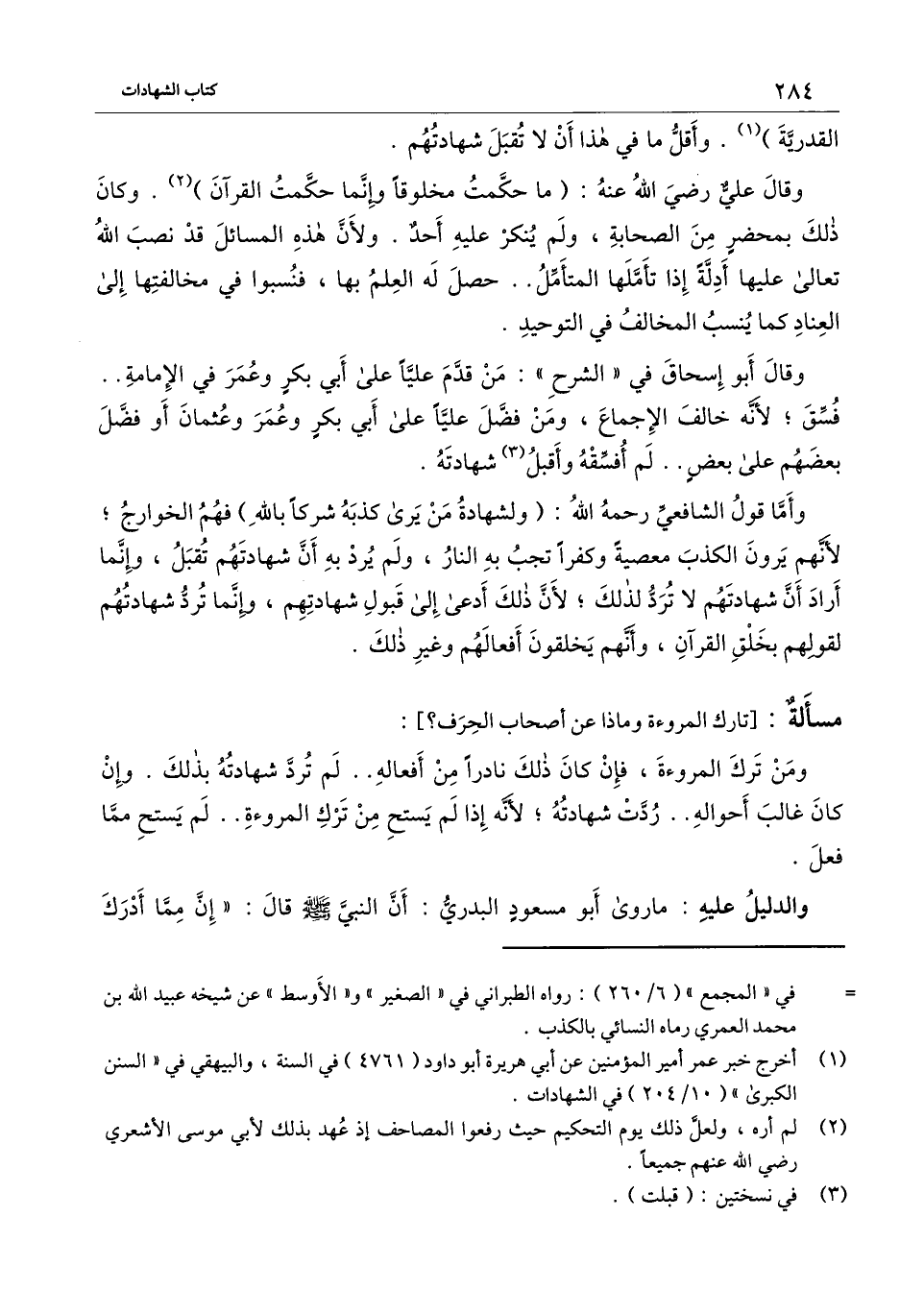 وقال علي - رَضِيَ اللَّهُ عَنْهُ -: (ما حكمت مخلوقا وإنما حكمت القرآن) . وكان ذلك بمحضر من الصحابة، ولم ينكر عليه أحد. ولأن هذه المسائل قد نصب الله تعالى عليها أدلة إذا تأملها المتأمل.. حصل له العلم بها، فنسبوا في مخالفتها إلى العناد كما ينسب المخالف في التوحيد.