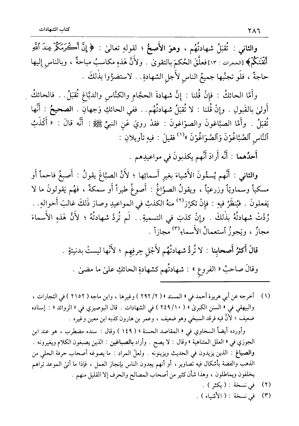 وأما الحائك: فإن قلنا: إن شهادة الحجام والكناس والدباغ تقبل.. فالحائك أولى بالقبول. وإن قلنا: لا تقبل شهادتهم.. ففي الحائك وجهان. الصحيح: أنها تقبل. وأما الصباغون والصواغون: فقد روي عن النبي - صَلَّى اللَّهُ عَلَيْهِ وَسَلَّمَ -: أنه قال: «أكذب الناس الصباغون والصواغون» فقيل: فيه تأويلان: