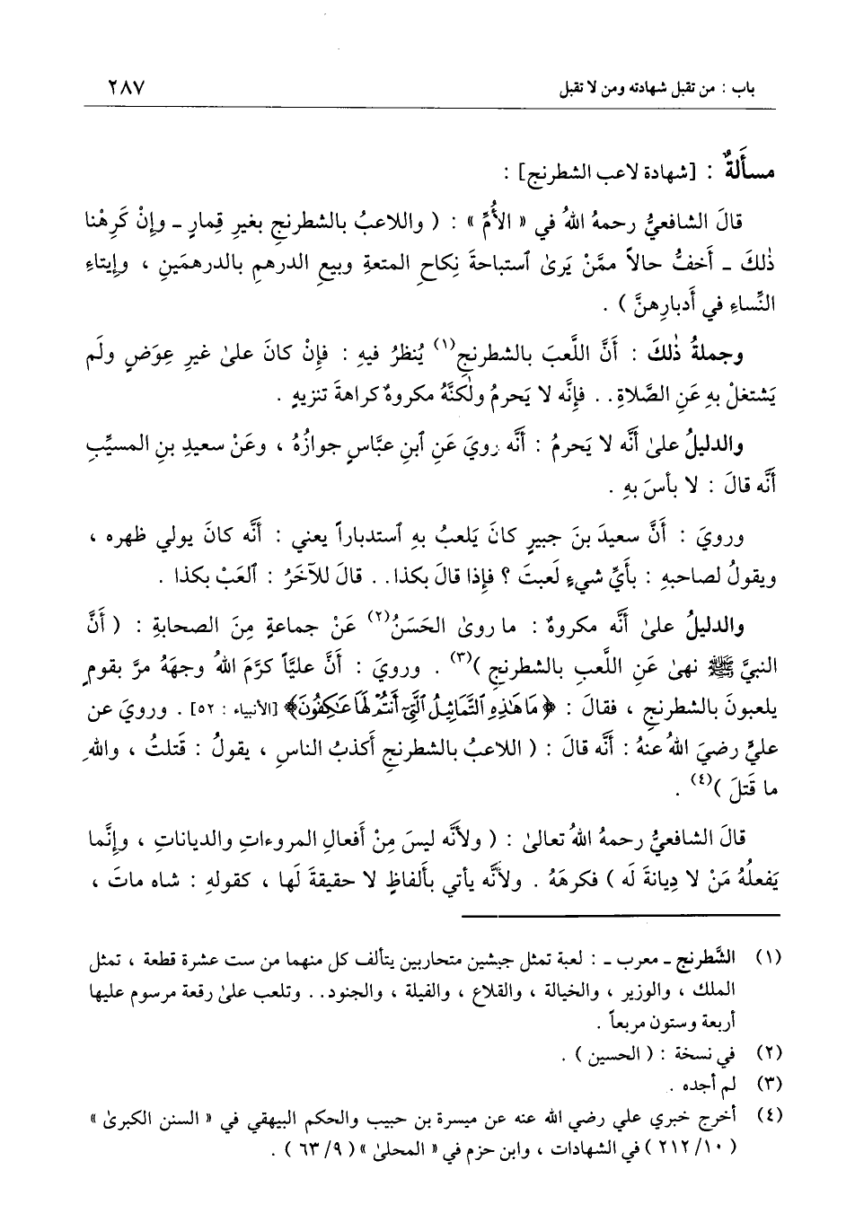 والدليل على أنه مكروه: ما روى الحسن عن جماعة من الصحابة: «أن النبي - صَلَّى اللَّهُ عَلَيْهِ وَسَلَّمَ - نهى عن اللعب بالشطرنج» . وروي: أن عليا كرم الله وجهه مر بقوم يلعبون بالشطرنج، فقال: {مَا هَذِهِ التَّمَاثِيلُ الَّتِي أَنْتُمْ لَهَا عَاكِفُونَ} [الأنبياء: 52] [الأنبياء: 52] . وروي عن علي - رَضِيَ اللَّهُ عَنْهُ -: أنه قال: (اللاعب بالشطرنج أكذب الناس، يقول: قتلت، والله ما قتل) .