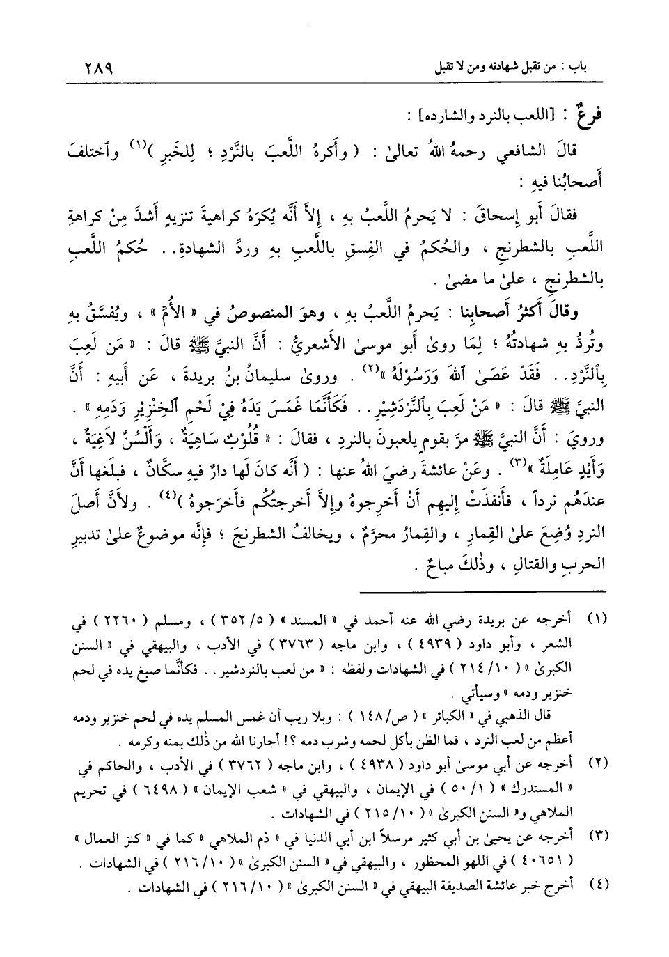 وقال أكثر أصحابنا: يحرم اللعب به، وهو المنصوص في " الأم "، ويفسق به وترد به شهادته؛ لما روى أبو موسى الأشعري: أن النبي - صَلَّى اللَّهُ عَلَيْهِ وَسَلَّمَ - قال: «من لعب بالنرد.. فقد عصى الله ورسوله» . وروى سليمان بن بريدة، عن أبيه: أن النبي - صَلَّى اللَّهُ عَلَيْهِ وَسَلَّمَ - قال: «من لعب بالنردشير.. فكأنما غمس يده في لحم الخنزير ودمه» . وروي: «أن النبي - صَلَّى اللَّهُ عَلَيْهِ وَسَلَّمَ - مر بقوم يلعبون بالنرد، فقال: " قلوب ساهية، وألسن لاغية، وأيد عاملة» . وعن عائشة - رَضِيَ اللَّهُ عَنْهَا -: (أنه كان لها دار فيها سكان، فبلغها أن عندهم نردا، فأنفذت إليهم أن أخرجوه وإلا أخرجتكم فأخرجوه) . ولأن أصل النرد وضع على القمار، والقمار محرم، ويخالف الشطرنج؛ فإنه موضوع على تدبير الحرب والقتال، وذلك مباح.