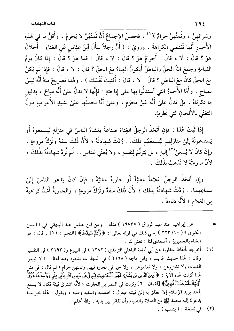 إذا ثبت هذا: فإن اتخذ الرجل الغناء صناعة يغشاه الناس في منزله ليسمعوه أو يستدعونه إلى منازلهم ليسمعهم ذلك.. ردت شهادته؛ لأن ذلك سفه وترك مروءة. وإن كان لا يسعى إليه، بل يترنم لنفسه، ولا يغني للناس.. لم ترد شهادته بذلك؛ لأن مروءته لا تذهب بذلك.