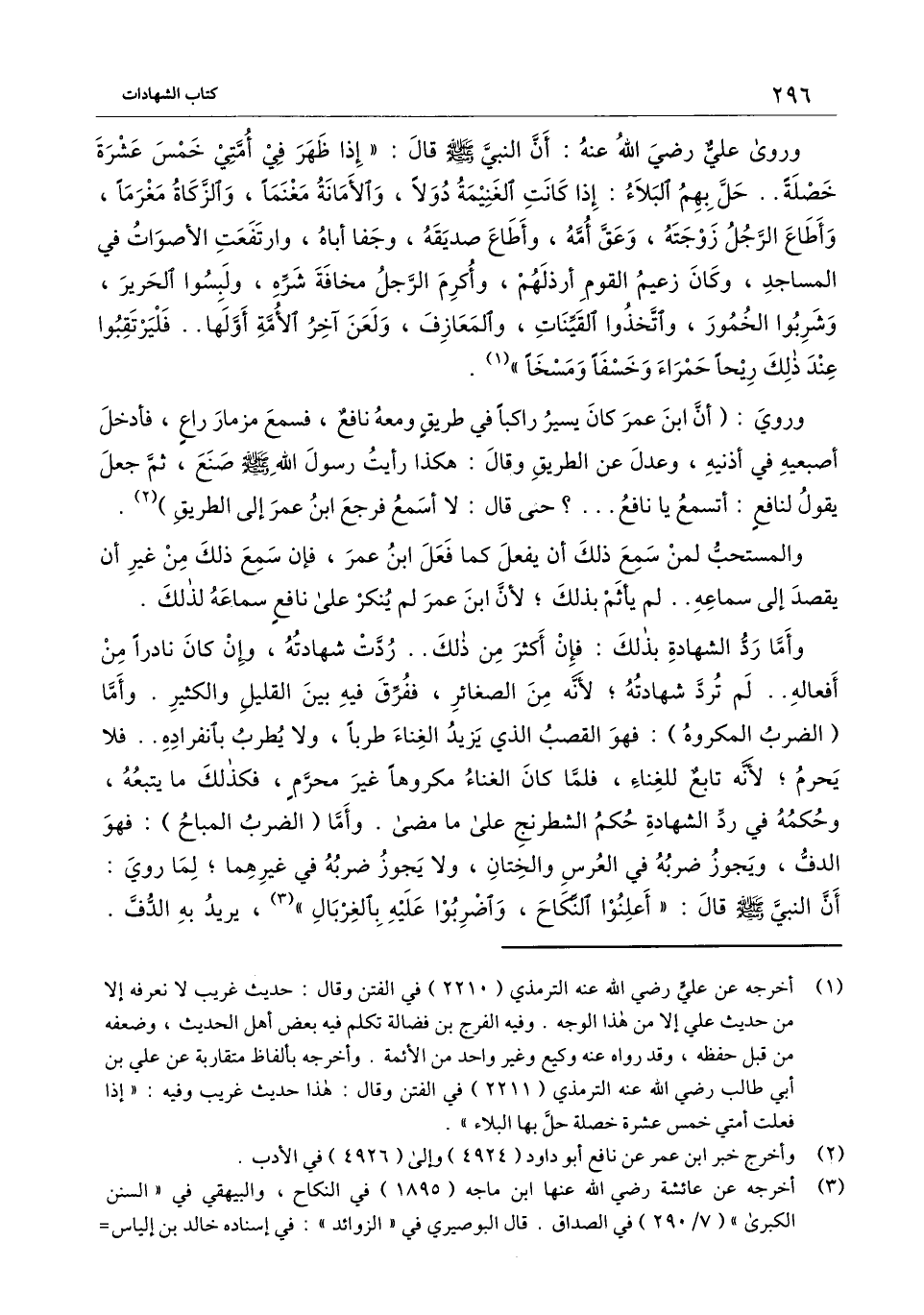 وروي: (أن ابن عمر كان يسير راكبا في طريق ومعه نافع، فسمع مزمار راع، فأدخل أصبعيه في أذنيه، وعدل عن الطريق وقال: هكذا رأيت رسول الله - صَلَّى اللَّهُ عَلَيْهِ وَسَلَّمَ - صنع، ثم جعل يقول لنافع: أتسمع يا نافع ... ؟ حتى قال: لا أسمع فرجع ابن عمر إلى الطريق) .