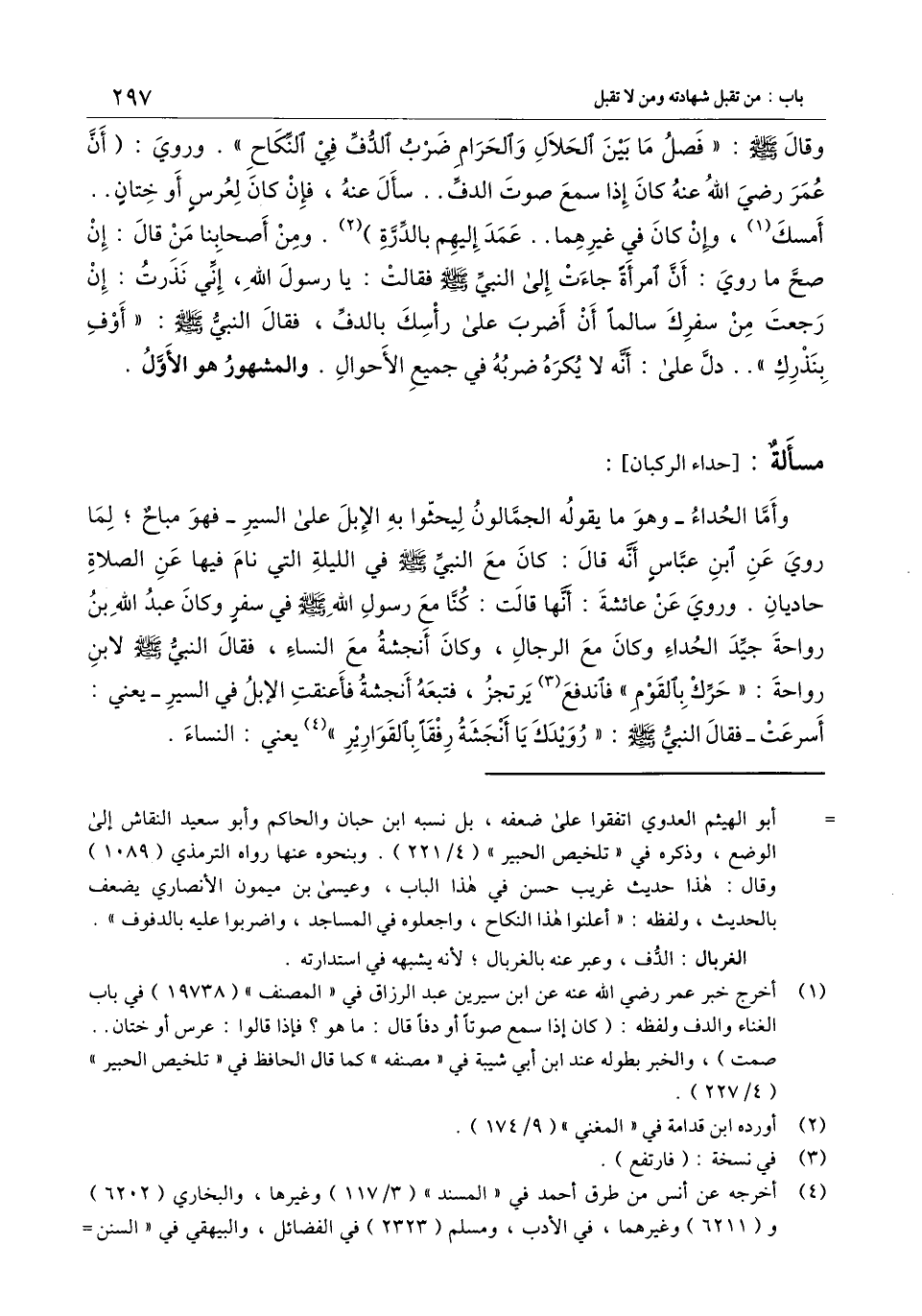 مسألة: [حداء الركبان] : وأما الحداء - وهو ما يقوله الجمالون ليحثوا به الإبل على السير - فهو مباح؛ لما روي «عن ابن عباس أنه قال: كان مع النبي - صَلَّى اللَّهُ عَلَيْهِ وَسَلَّمَ - في الليلة التي نام فيها عن الصلاة حاديان» . وروي «عن عائشة: أنها قالت: كنا مع رسول الله - صَلَّى اللَّهُ عَلَيْهِ وَسَلَّمَ - في سفر وكان عبد الله بن رواحة جيد الحداء وكان مع الرجال، وكان أنجشة مع النساء، فقال النبي - صَلَّى اللَّهُ عَلَيْهِ وَسَلَّمَ - لابن رواحة: " حرك بالقوم " فاندفع يرتجز، فتبعه أنجشة فأعنقت الإبل في السير - يعني: أسرعت - فقال النبي - صَلَّى اللَّهُ عَلَيْهِ وَسَلَّمَ -: " رويدك يا أنجشة رفقا بالقوارير» يعني: النساء.