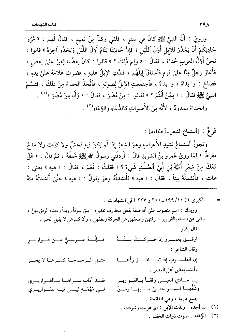 ] : ويجوز استماع نشيد الأعراب وهو الشعر إذا لم يكن فيه فحش ولا كذب ولا مدح مفرط؛ لما «روى عمرو بن الشريد قال: أردفني رسول الله - صَلَّى اللَّهُ عَلَيْهِ وَسَلَّمَ - خلفه، ثم قال: " هل معك من شعر أمية بن أبي الصلت شيء؟ " فقلت: نعم، فقال: " هيه " يعني: هات، فأنشدته بيتا، فقال: " هيه " فأنشدته وهو يقول: " هيه " حتى أنشدته مائة