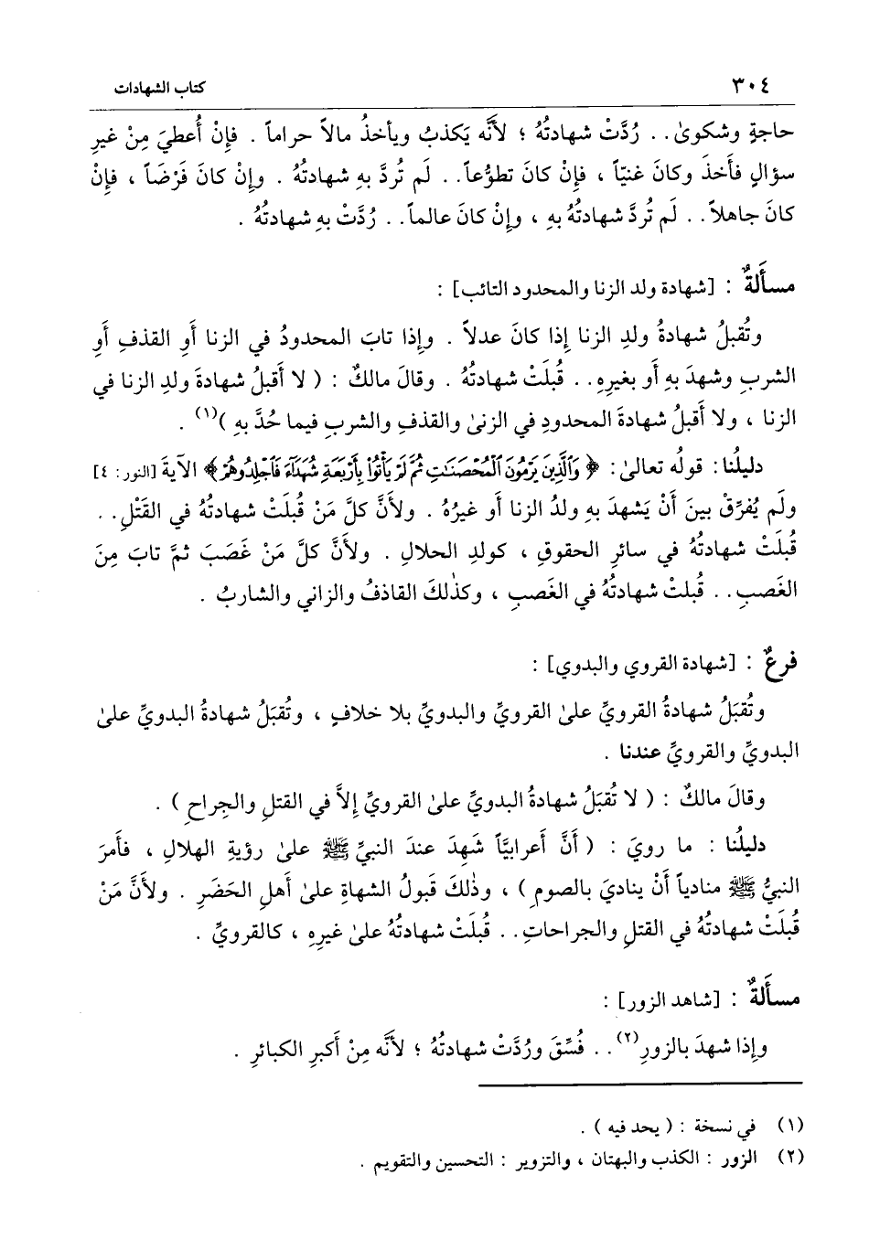 ] : وتقبل شهادة ولد الزنا إذا كان عدلا. وإذا تاب المحدود في الزنا أو القذف أو الشرب وشهد به أو بغيره.. قبلت شهادته. وقال مالك: (لا أقبل شهادة ولد الزنا في الزنا، ولا أقبل شهادة المحدود في الزنى والقذف والشرب فيما حد به) .
