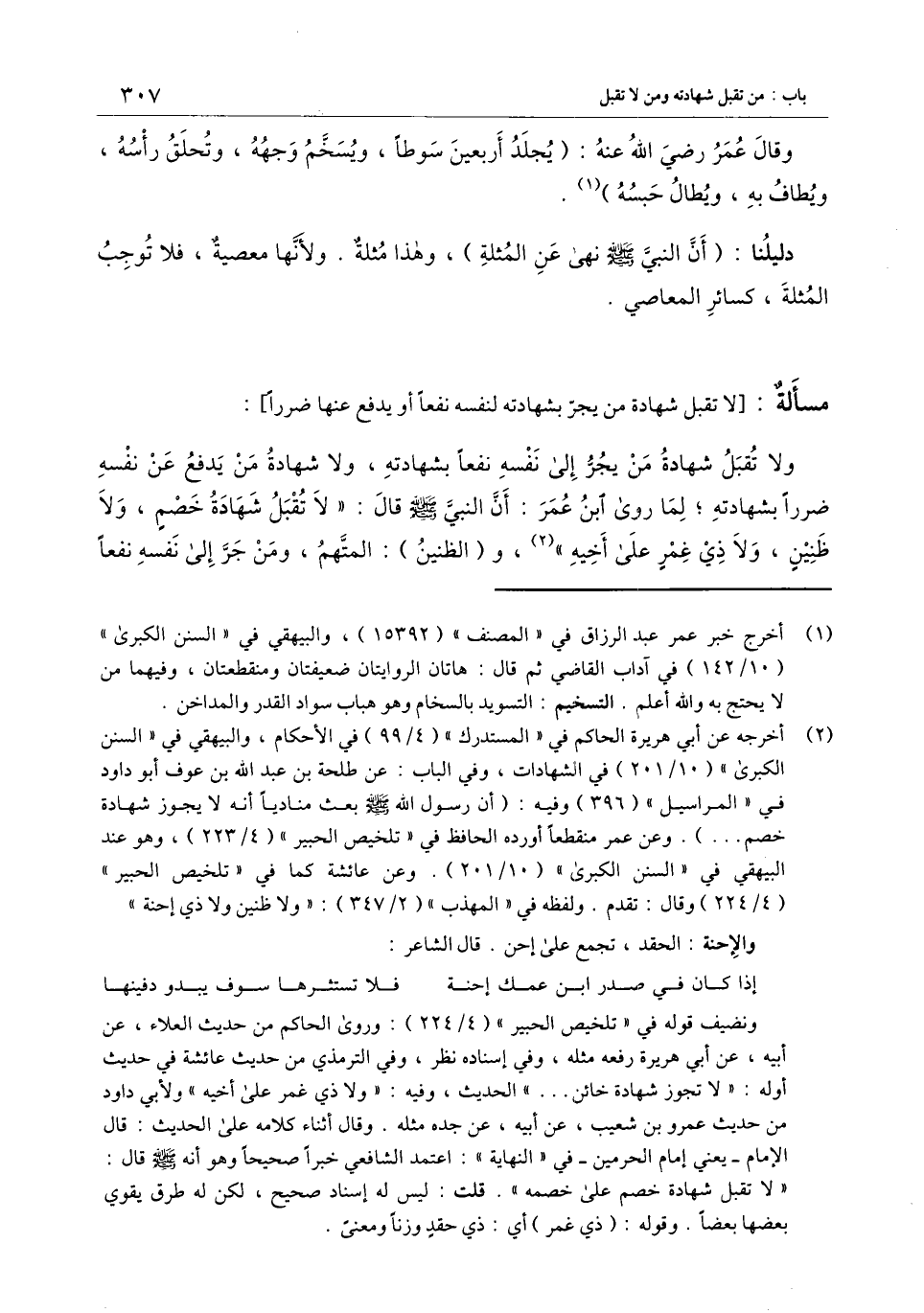 مسألة: [لا تقبل شهادة من يجر بشهادته لنفسه نفعا أو يدفع عنها ضررا] : ولا تقبل شهادة من يجر إلى نفسه نفعا بشهادته، ولا شهادة من يدفع عن نفسه ضررا بشهادته؛ لما روى ابن عمر: أن النبي - صَلَّى اللَّهُ عَلَيْهِ وَسَلَّمَ - قال: «لا تقبل شهادة خصم، ولا ظنين، ولا ذي غمر على أخيه» ، و (الظنين) : المتهم، ومن جر إلى نفسه نفعا