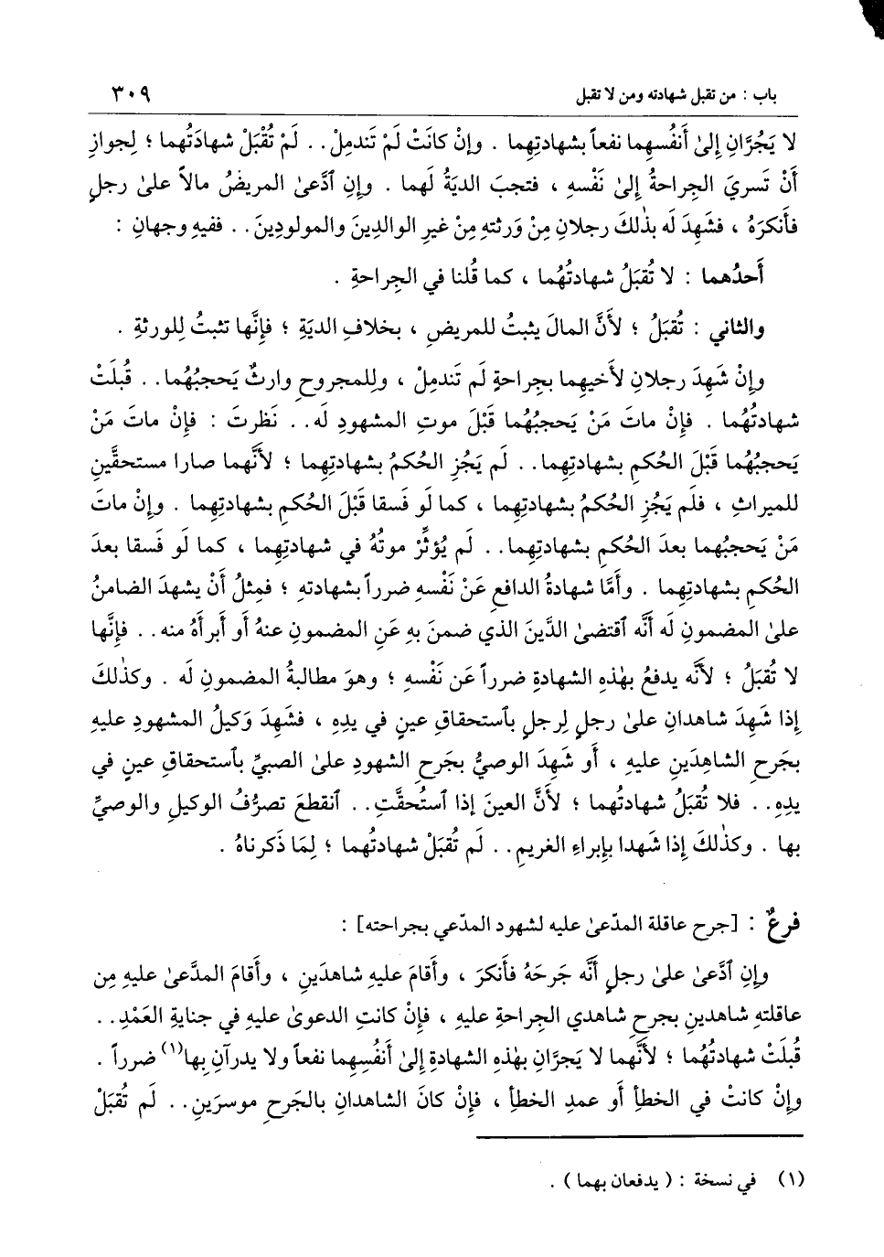 لا يجران إلى أنفسهما نفعا بشهادتهما. وإن كانت لم تندمل.. لم تقبل شهادتهما؛ لجواز أن تسري الجراحة إلى نفسه، فتجب الدية لهما. وإن ادعى المريض مالا على رجل فأنكره، فشهد له بذلك رجلان من ورثته من غير الوالدين والمولودين.. ففيه وجهان: