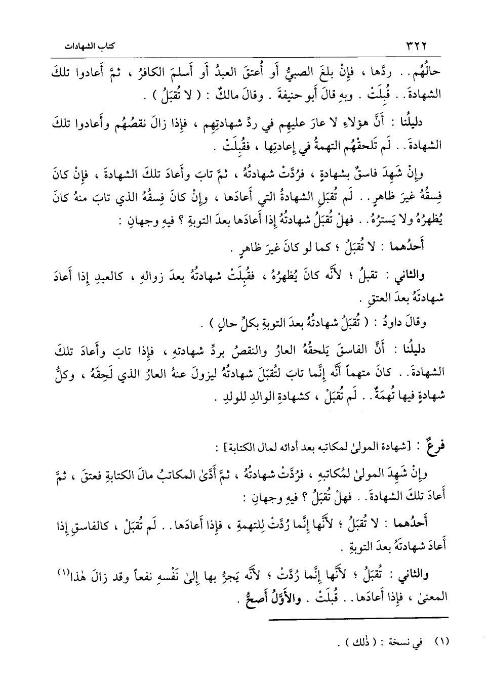 حالهم.. ردها، فإن بلغ الصبي أو أعتق العبد أو أسلم الكافر، ثم أعادوا تلك الشهادة.. قبلت. وبه قال أبو حنيفة. وقال مالك: (لا تقبل) .