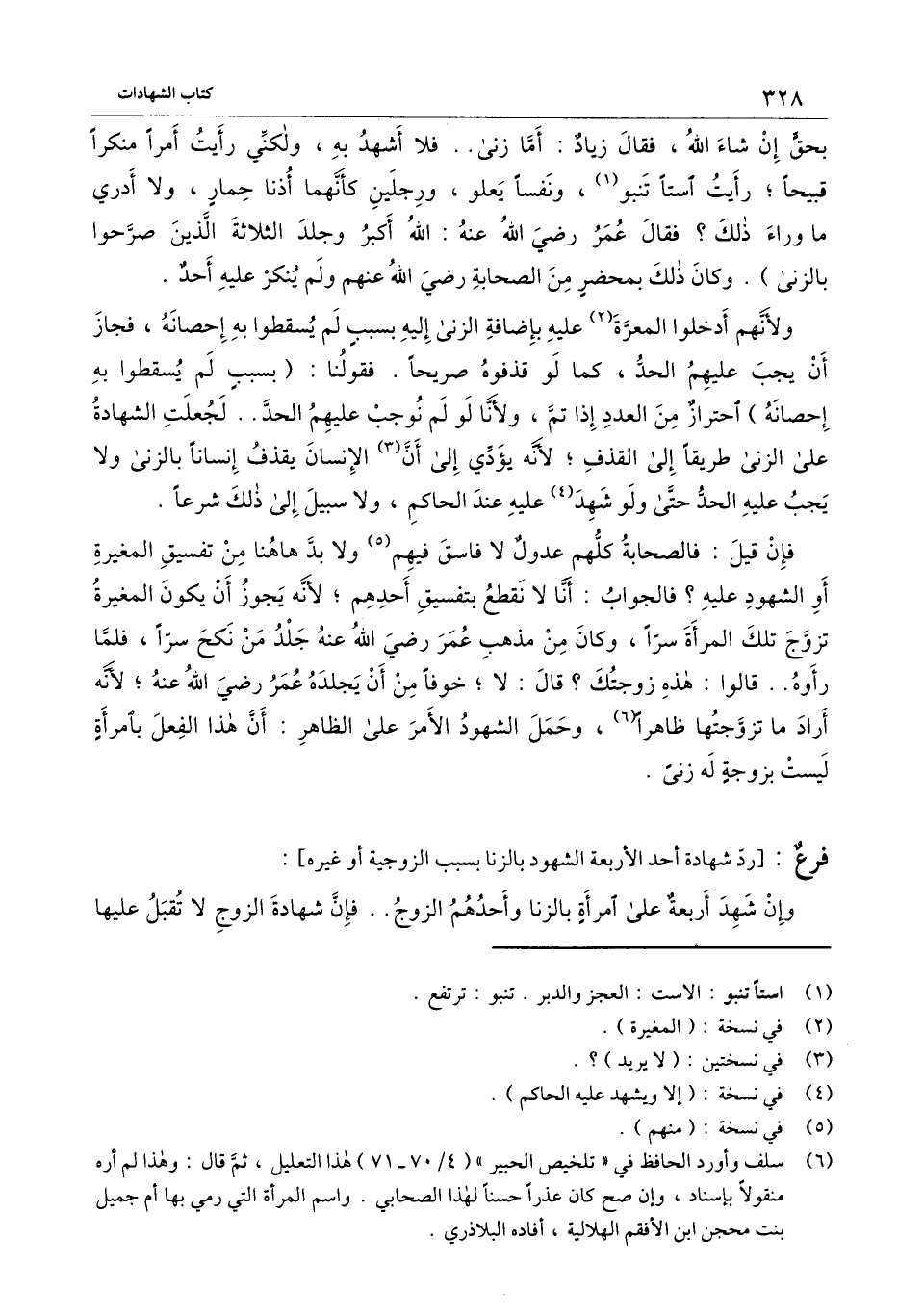 بحق إن شاء الله، فقال زياد: أما زنى.. فلا أشهد به، ولكني رأيت أمرا منكرا قبيحا؛ رأيت استا تنبو، ونفسا يعلو، ورجلين كأنهما أذنا حمار، ولا أدري ما وراء ذلك، فقال عمر - رَضِيَ اللَّهُ عَنْهُ -: الله أكبر، وجلد الثلاثة الذين صرحوا بالزنى) . وكان ذلك بمحضر من الصحابة - رَضِيَ اللَّهُ عَنْهُمْ - ولم ينكر عليه أحد.