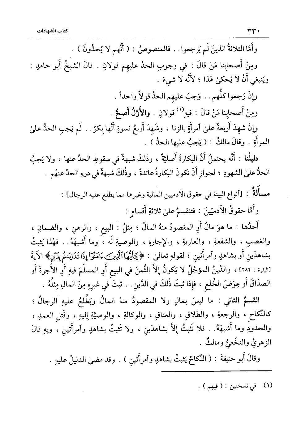 أحدها: ما هو مال أو المقصود منه المال؛ مثل: البيع، والرهن، والضمان، والغصب، والشفعة، والعارية، والإجارة، والوصية له، وما أشبهه.. فهذا يثبت بشاهدين أو بشاهد وامرأتين؛ لِقَوْلِهِ تَعَالَى: {يَا أَيُّهَا الَّذِينَ آمَنُوا إِذَا تَدَايَنْتُمْ بِدَيْنٍ} [البقرة: 282] الآية [البقرة: 282] ، والدين المؤجل لا يكون إلا الثمن في البيع أو المسلم فيه أو الأجرة أو الصداق أو عوض الخلع، فإذا ثبت ذلك في الدين.. ثبت في غيره من المال مثله.