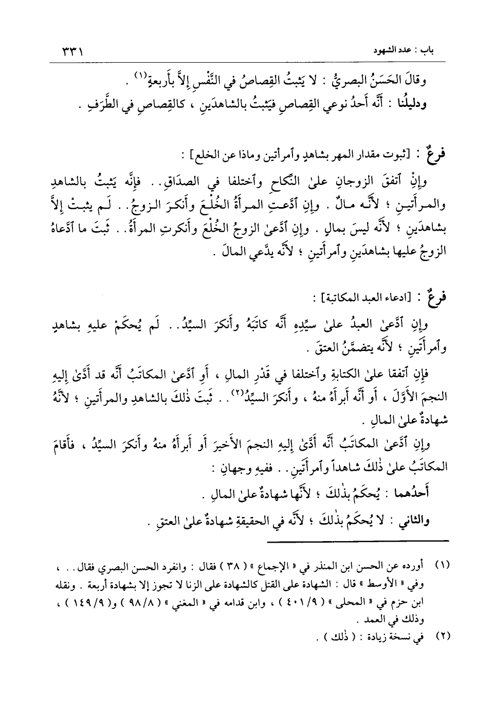 وماذا عن الخلع] : وإن اتفق الزوجان على النكاح واختلفا في الصداق.. فإنه يثبت بالشاهد والمرأتين، لأنه مال. وإن ادعت المرأة الخلع وأنكر الزوج.. لم يثبت إلا بشاهدين؛ لأنه ليس بمال وإن ادعى الزوج الخلع وأنكرت المرأة.. ثبت ما ادعاه الزوج عليها بشاهدين وامرأتين؛ لأنه يدعي المال.