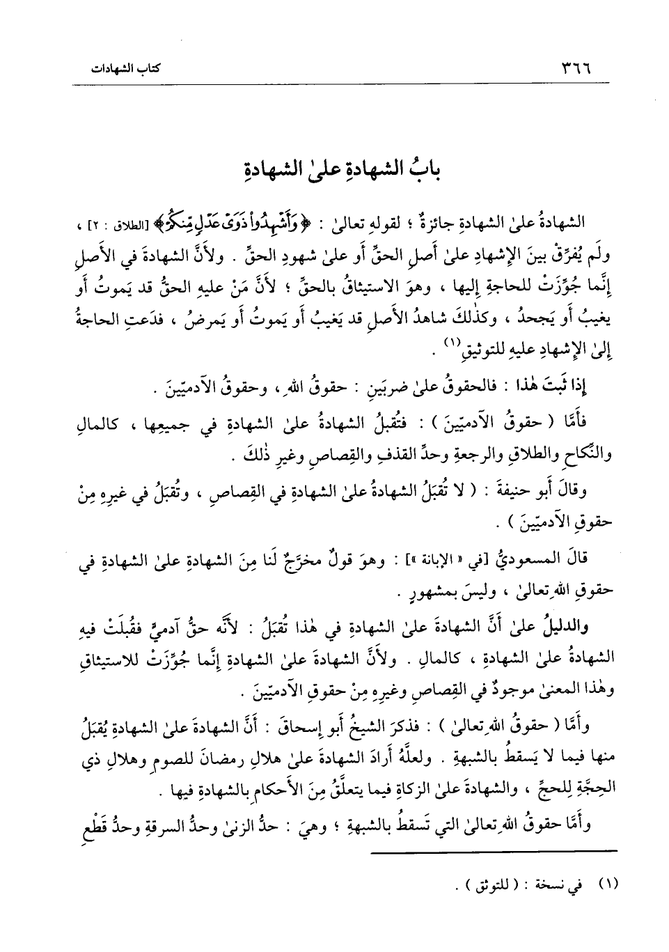 وأما (حقوق الله تعالى) : فذكر الشيخ أبو إسحاق: أن الشهادة على الشهادة يقبل منها فيما لا يسقط بالشبهة. ولعله أراد الشهادة على هلال رمضان للصوم وهلال ذي الحجة للحج، والشهادة على الزكاة فيما يتعلق من الأحكام بالشهادة فيها.
