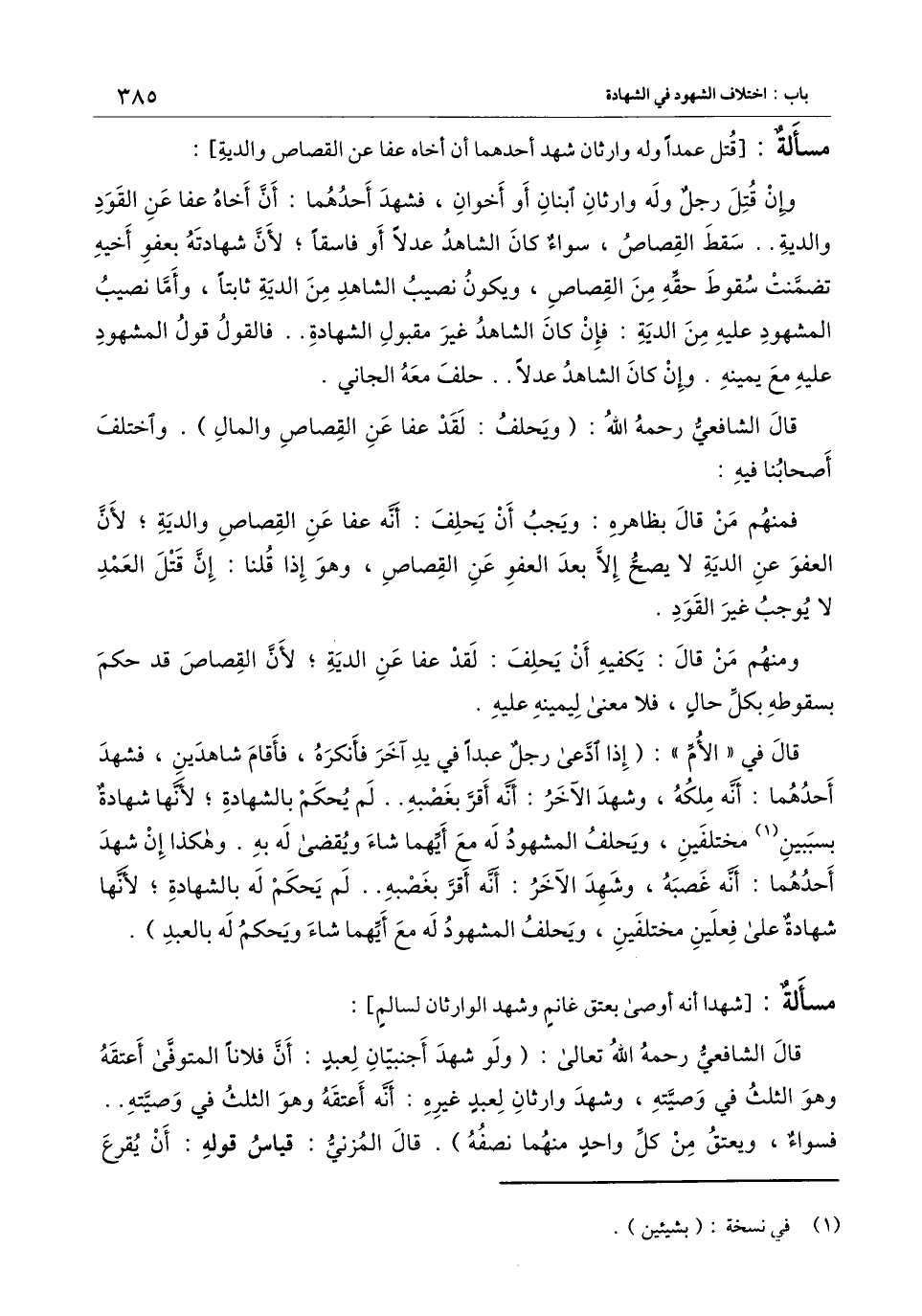 وإن قتل رجل وله وارثان ابنان أو أخوان، فشهد أحدهما: أن أخاه عفا عن القود والدية.. سقط القصاص، سواء كان الشاهد عدلا أو فاسقا؛ لأن شهادته بعفو أخيه تضمنت سقوط حقه من القصاص، ويكون نصيب الشاهد من الدية ثابتا، وأما نصيب المشهود عليه من الدية: فإن كان الشاهد غير مقبول الشهادة.. فالقول قول المشهود عليه مع يمينه. وإن كان الشاهد عدلا.. حلف معه الجاني.