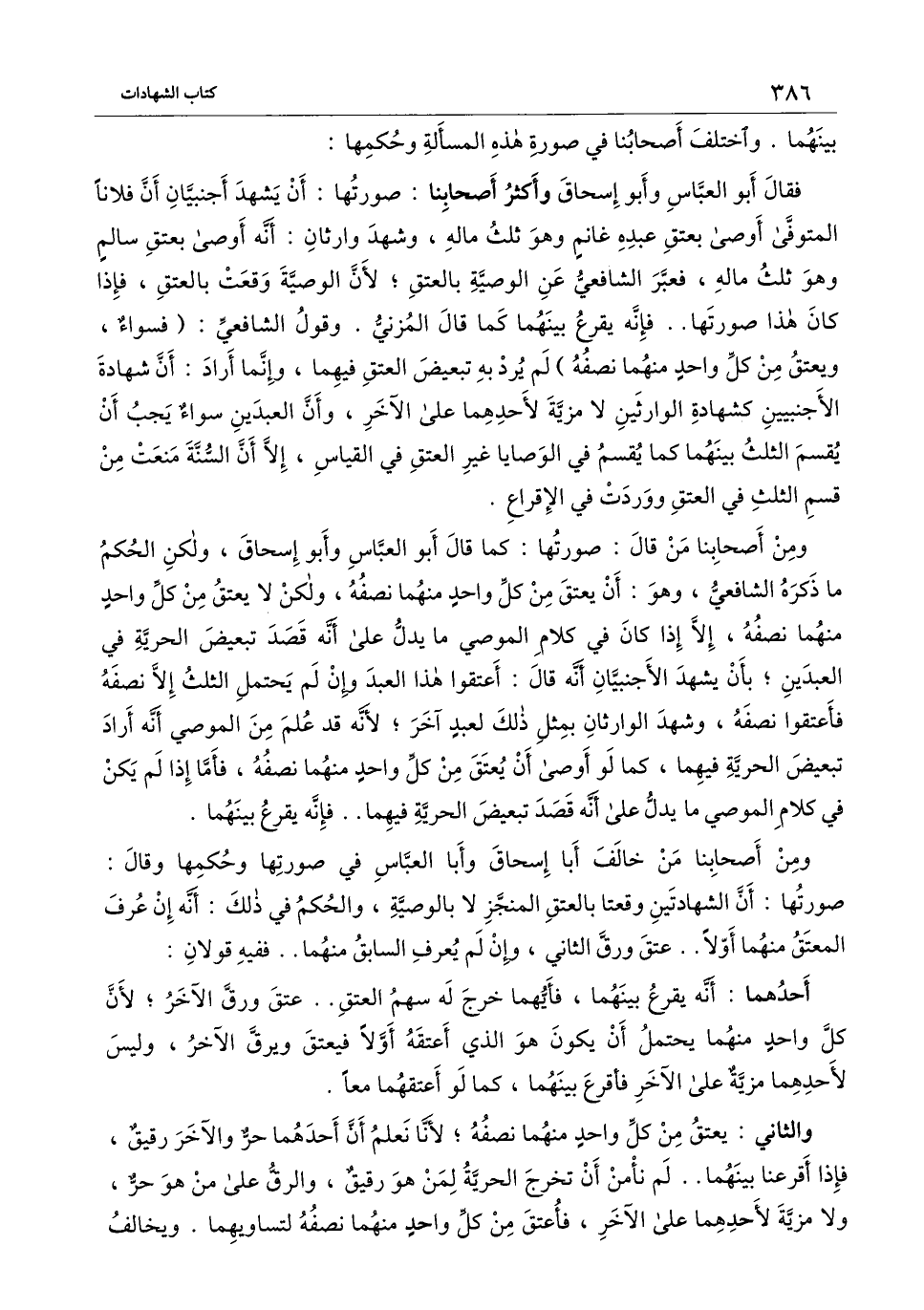 ومن أصحابنا من خالف أبا إسحاق وأبا العباس في صورتها وحكمها وقال: صورتها: أن الشهادتين وقعتا بالعتق المنجز لا بالوصية، والحكم في ذلك: أنه إن عرف المعتق منهما أولا.. عتق ورق الثاني، وإن لم يعرف السابق منهما.. ففيه قولان: