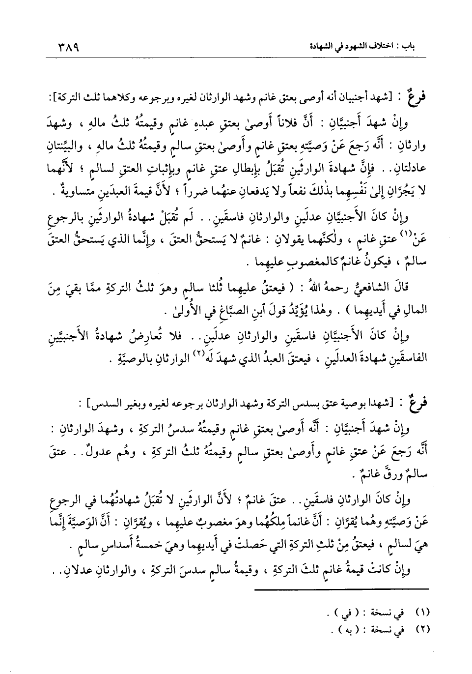 وإن كان الأجنبيان عدلين والوارثان فاسقين.. لم تقبل شهادة الوارثين بالرجوع عن عتق غانم، ولكنهما يقولان: غانم لا يستحق العتق، وإنما الذي يستحق العتق سالم، فيكون غانم كالمغصوب عليهما.