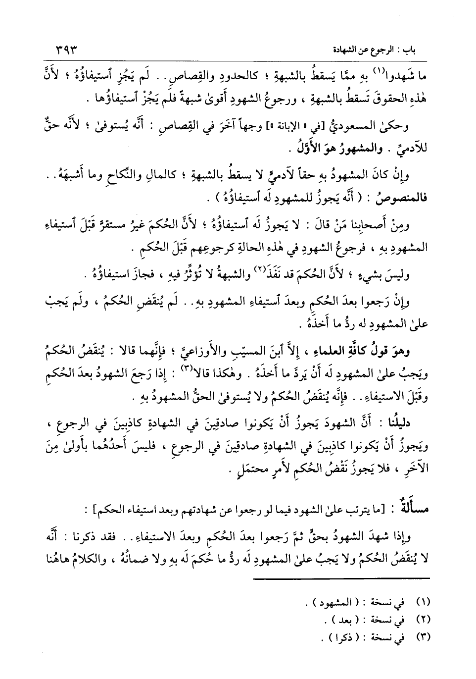 وإن كان المشهود به حقا لآدمي لا يسقط بالشبهة؛ كالمال والنكاح وما أشبهه.. فالمنصوص: (أنه يجوز للمشهود له استيفاؤه) .