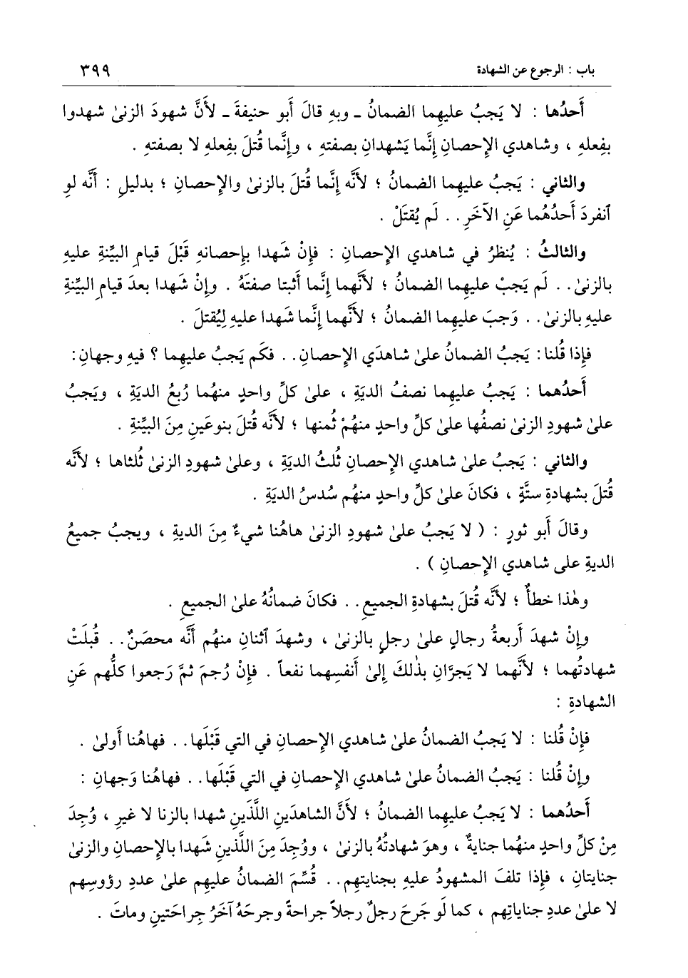 والثالث: ينظر في شاهدي الإحصان: فإن شهدا بإحصانه قبل قيام البينة عليه بالزنى.. لم يجب عليهما الضمان؛ لأنهما إنما أثبتا صفته. وإن شهدا بعد قيام البينة عليه بالزنى.. وجب عليهما الضمان؛ لأنهما إنما شهدا عليه ليقتل.