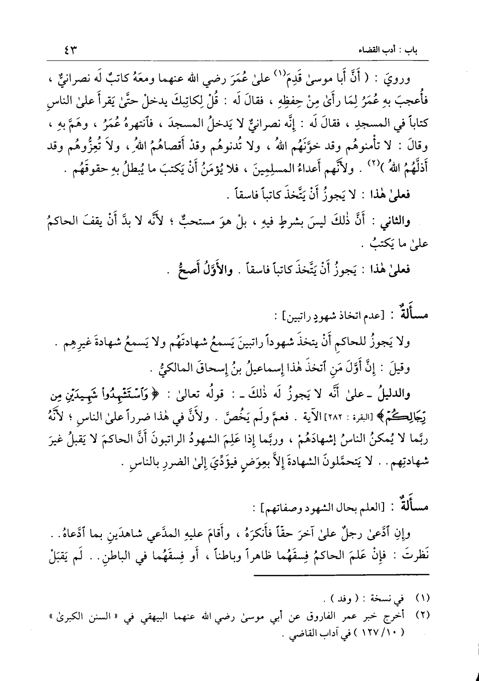 مسألة: [عدم اتخاذ شهود راتبين] : ولا يجوز للحاكم أن يتخذ شهودا راتبين يسمع شهادتهم ولا يسمع شهادة غيرهم. وقيل: إن أول من اتخذ هذا إسماعيل بن إسحاق المالكي.