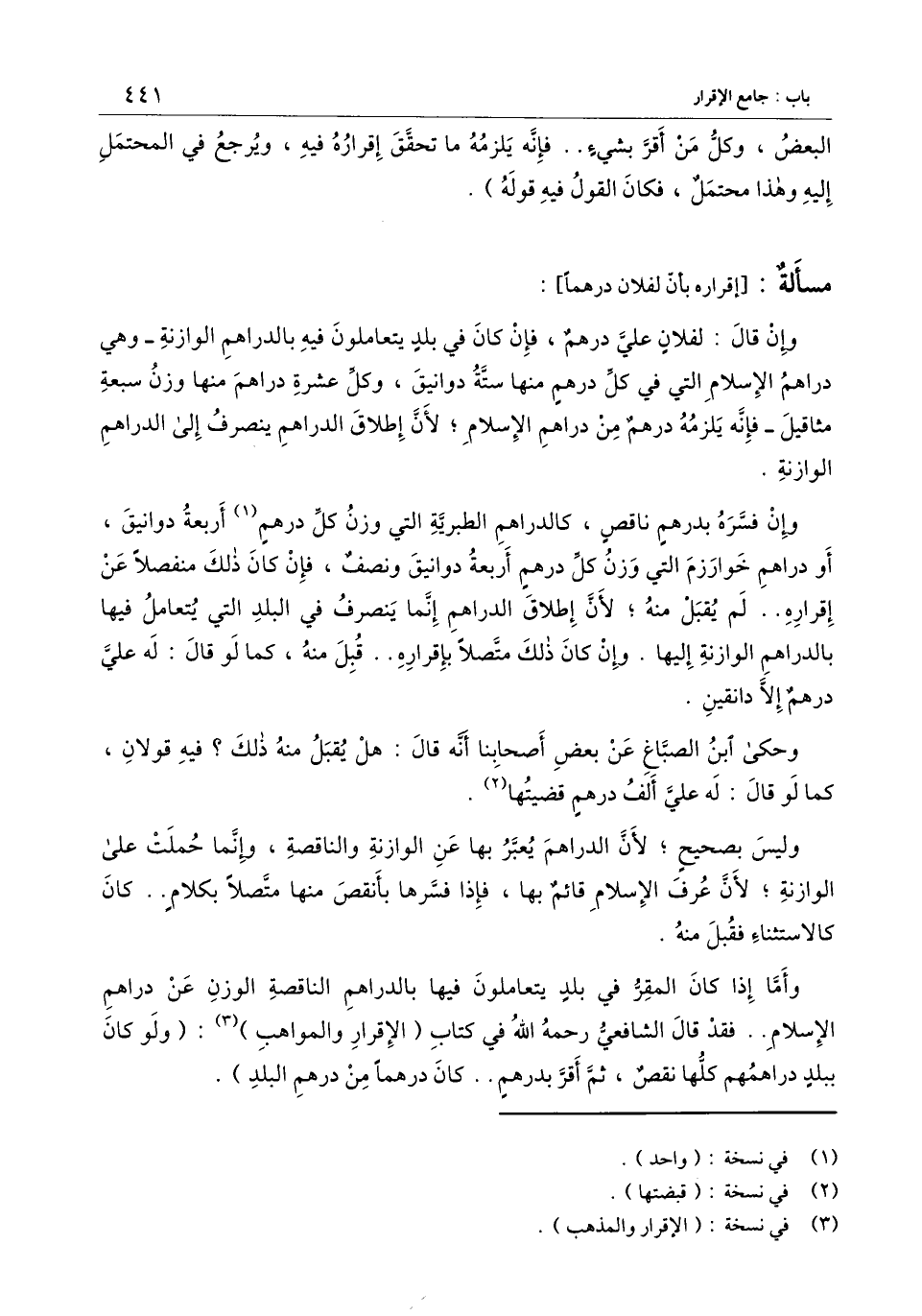 وإن فسره بدرهم ناقص، كالدراهم الطبرية التي وزن كل درهم أربعة دوانيق، أو دراهم خوارزم التي وزن كل درهم أربعة دوانيق ونصف، فإن كان ذلك منفصلا عن إقراره.. لم يقبل منه؛ لأن إطلاق الدراهم إنما ينصرف في البدل التي يتعامل فيها بالدراهم الوازنة إليها. وإن كان ذلك متصلا بإقراره.. قبل منه، كما لو قال: له علي درهم إلا دانقين.