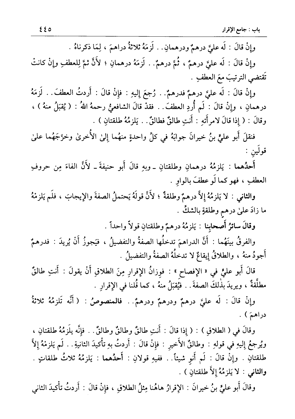 وإن قال: له علي درهم فدرهم.. رجع إليه: فإن قال: أردت العطف.. لزمه درهمان، وإن قال: لم أرد العطف.. فقد قال الشافعي - رَحِمَهُ اللَّهُ -: (يقبل منه) ، وقال: (إذا قال لامرأته: أنت طالق فطالق.. يلزمه طلقتان) .