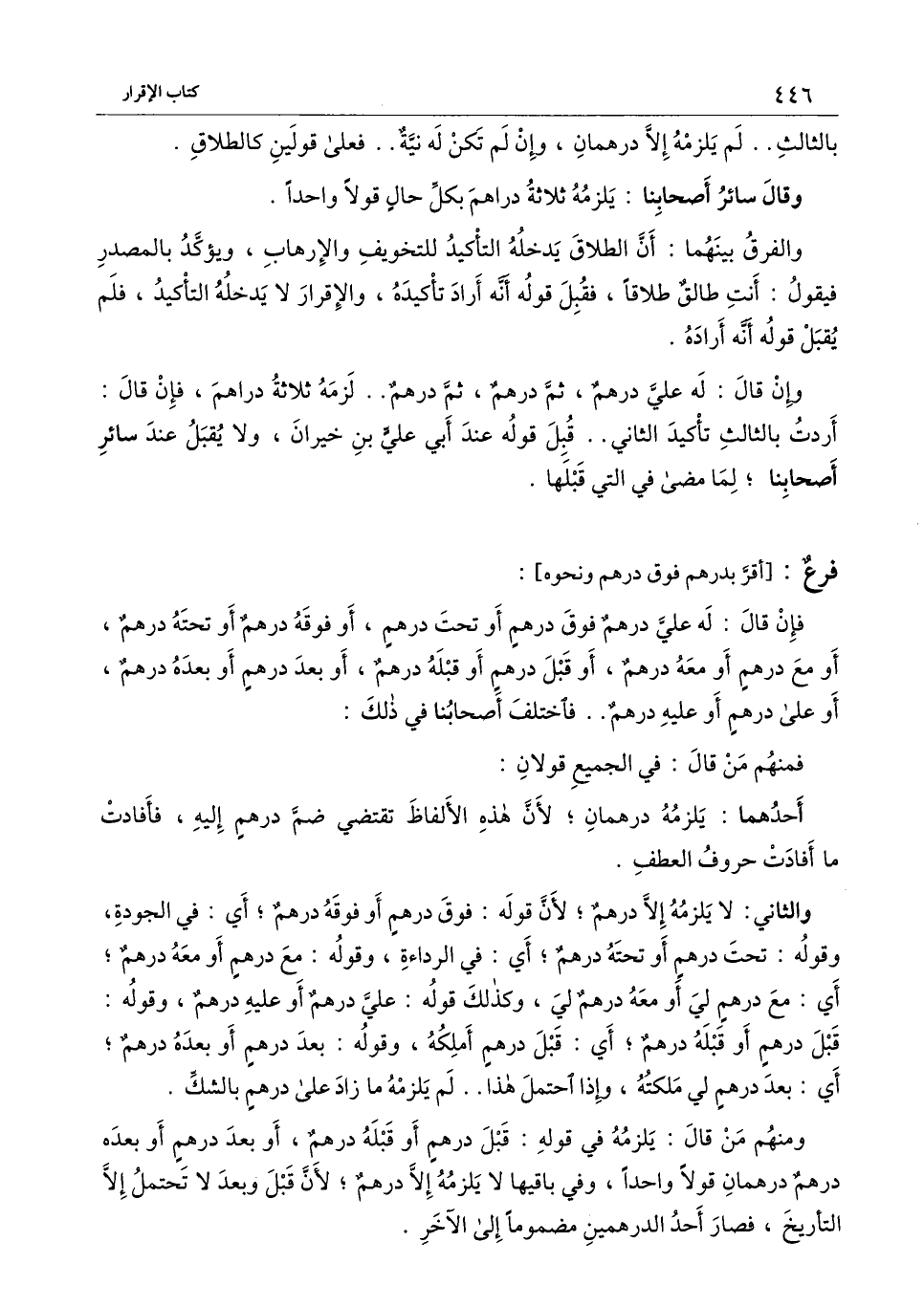 والثاني: لا يلزمه إلا درهم؛ لأن قوله: فوق درهم أو فوقه درهم؛ أي: في الجودة، وقوله: تحت درهم أو تحته درهم؛ أي: في الرداءة، وقوله: مع درهم أو معه درهم؛ أي مع درهم لي أو معه درهم لي، وكذلك قوله: علي درهم أو عليه درهم، وقوله: قبل درهم أو قبله درهم؛ أي: قبل درهم أملكه، وقوله: بعد درهم أو بعده درهم؛ أي: بعد درهم لي ملكته، وإذا احتمل هذا.. لم يلزمه ما زاد على درهم بالشك.