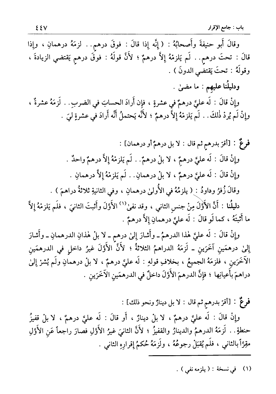 وقال أبو حنيفة وأصحابه: (إنه إذا قال: فوق درهم.. لزمه درهمان، وإذا قال: تحت درهم.. لم يلزمه إلا درهم؛ لأن قوله: فوق درهم يقتضي الزيادة، وقوله: تحت يقتضي الدون) .