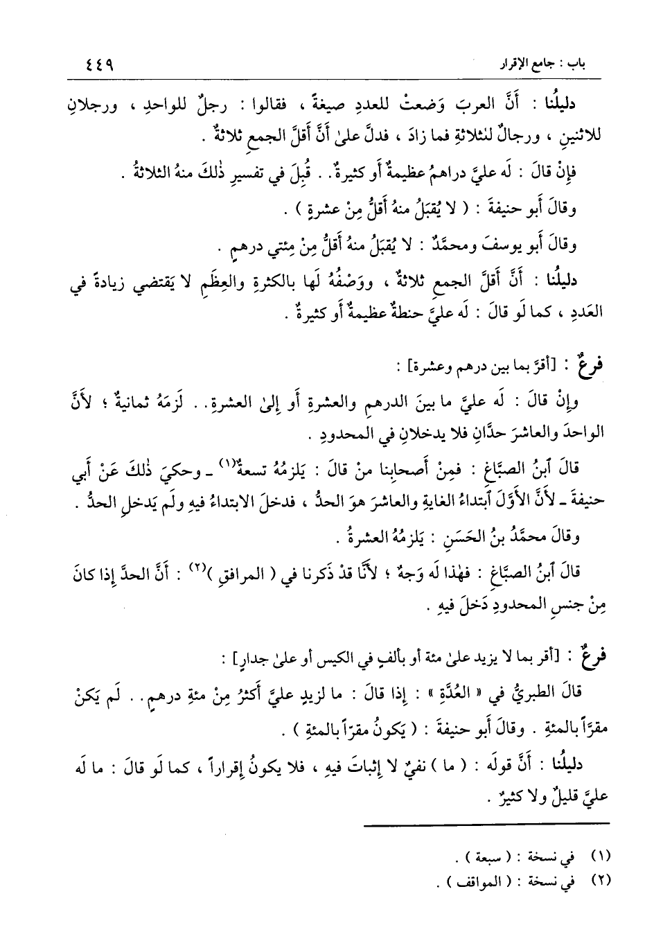 قال الطبري في " العدة ": إذا قال: ما لزيد علي أكثر من مائة درهم.. لم يكن مقرا بالمائة. وقال أبو حنيفة: (يكون مقرا بالمائة) .