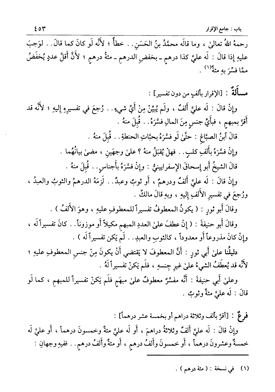 - رَحِمَهُ اللَّهُ تَعَالَى -، وما قاله محمد بن الحسن.. خطأ؛ لأنه لو كان كما قال.. لوجب عليه إذا قال: له علي درهم - بخفض الدرهم - مائة درهم؛ لأن أقل عدد يخفض مما فسر به مائة.