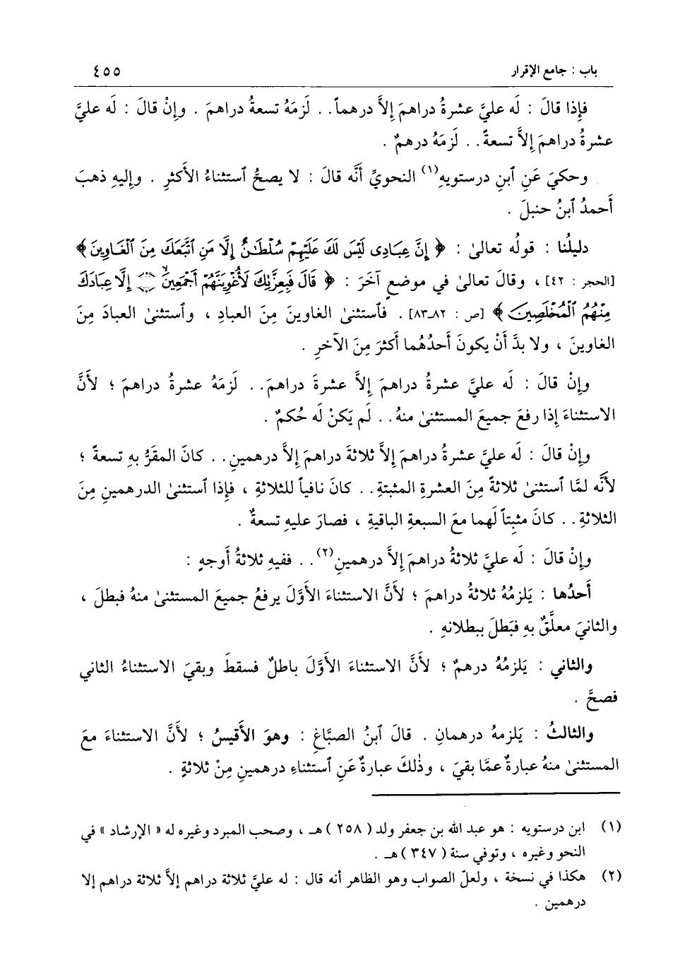 فإذا قال: له علي عشرة دراهم إلا درهما.. لزمه تسعة دراهم. وإن قال: له علي عشرة دراهم إلا تسعة.. لزمه درهم.