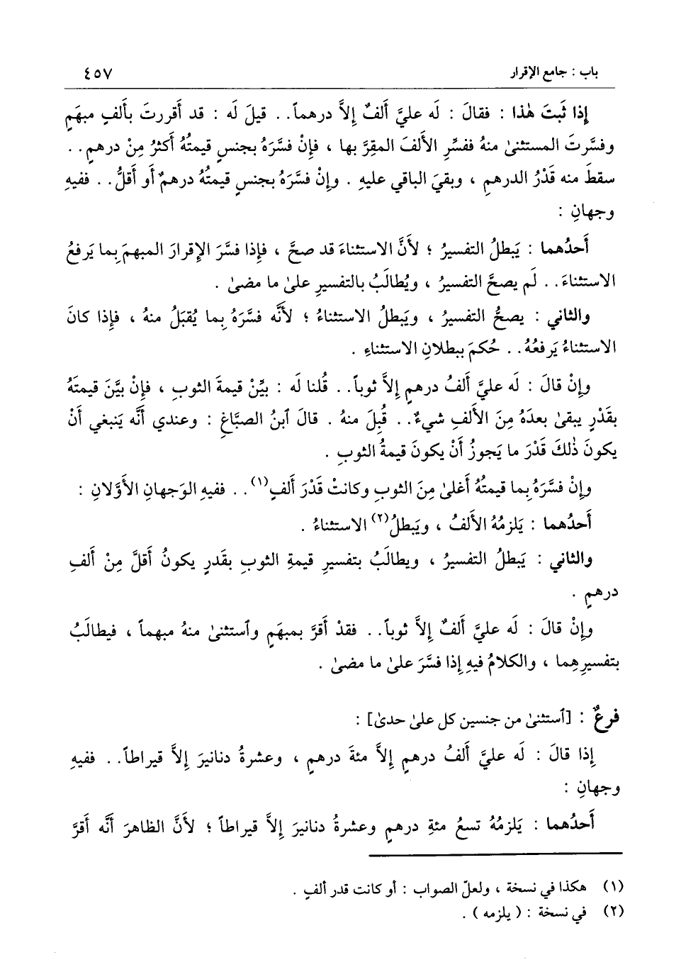 إذا ثبت هذا: فقال: له علي ألف إلا درهما.. قيل له: قد أقررت بألف مبهم وفسرت المستثنى منه ففسر الألف المقر بها، فإن فسره بجنس قيمته أكثر من درهم.. سقط منه قدر الدرهم، وبقي الباقي عليه. وإن فسره بجنس قيمته درهم أو أقل.. ففيه وجهان:
