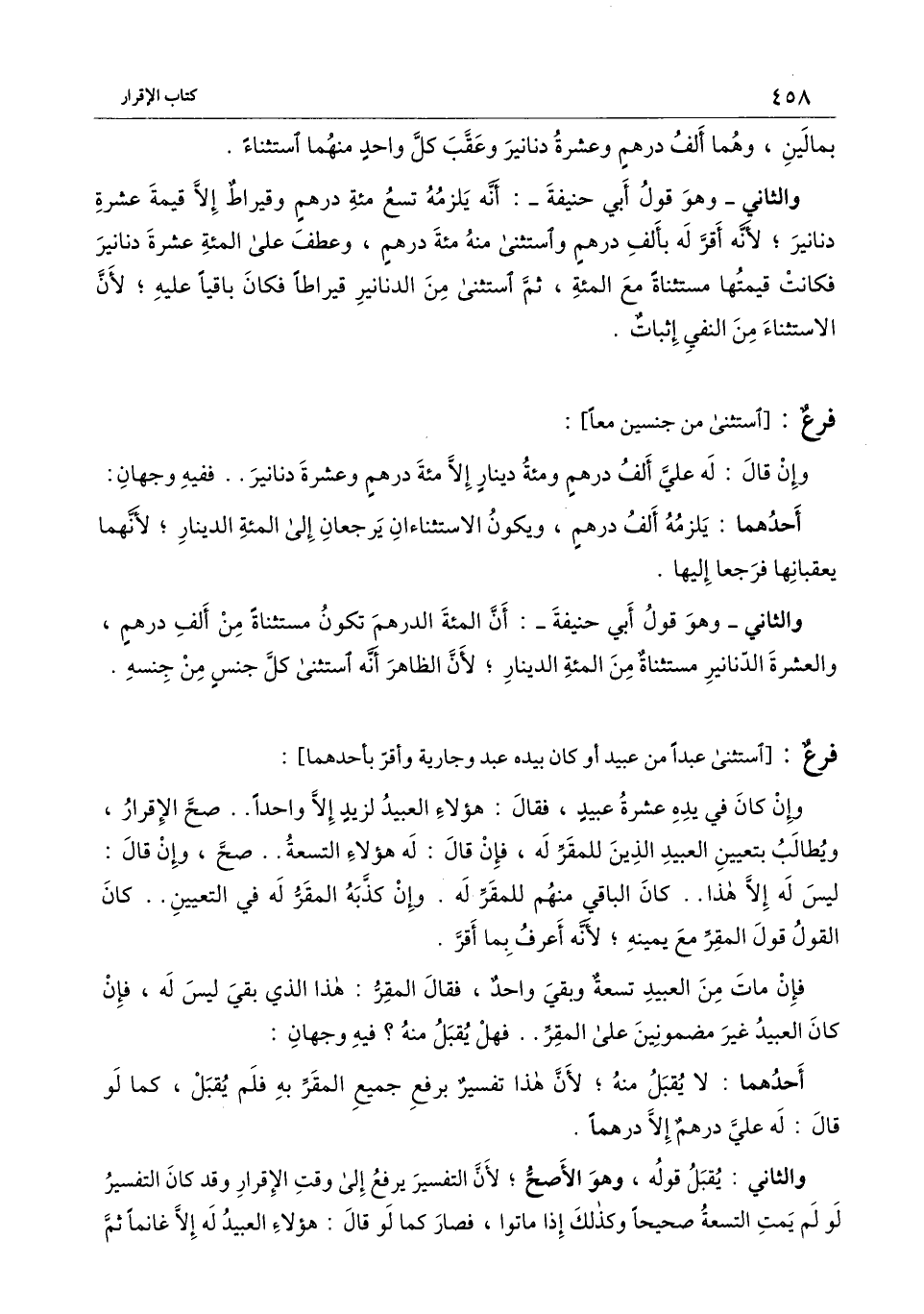 وإن كان في يده عشرة عبيد، فقال: هؤلاء العبيد لزيد إلا واحدا.. صح الإقرار، ويطالب بتعيين العبيد الذين للمقر له، فإن قال: له هؤلاء التسعة.. صح، وإن قال: ليس له إلا هذا.. كان الباقي منهم للمقر له. وإن كذبه المقر له في التعيين.. كان القول قول المقر مع يمينه؛ لأنه أعرف بما أقر.