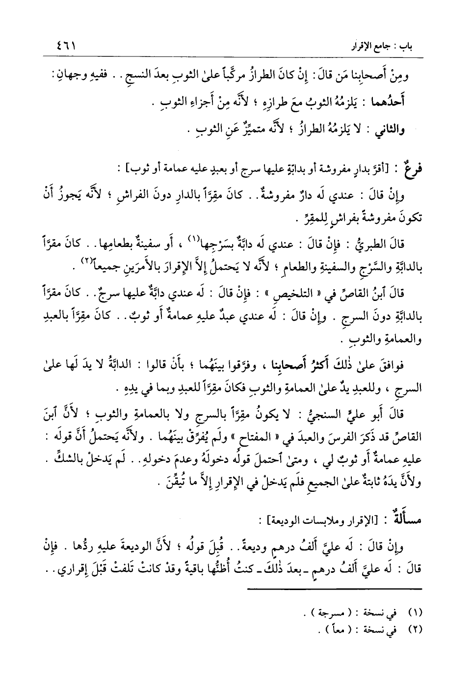 قال الطبري: فإن قال: عندي له دابة بسرجها، أو سفينة بطعامها.. كان مقرا بالدابة والسرج والسفينة والطعام؛ لأنه لا يحتمل إلا الإقرار بالأمرين جميعا.