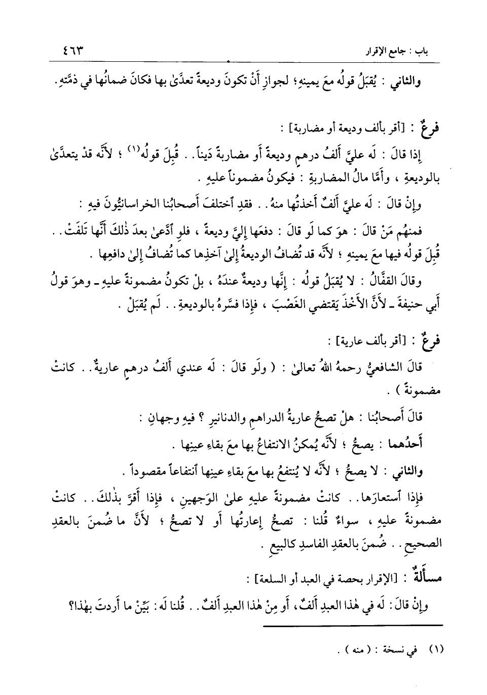 إذا قال: له علي ألف درهم وديعة أو مضاربة دينا.. قبل قوله؛ لأنه قد يتعدى بالوديعة، وأما مال المضاربة: فيكون مضمونا عليه.